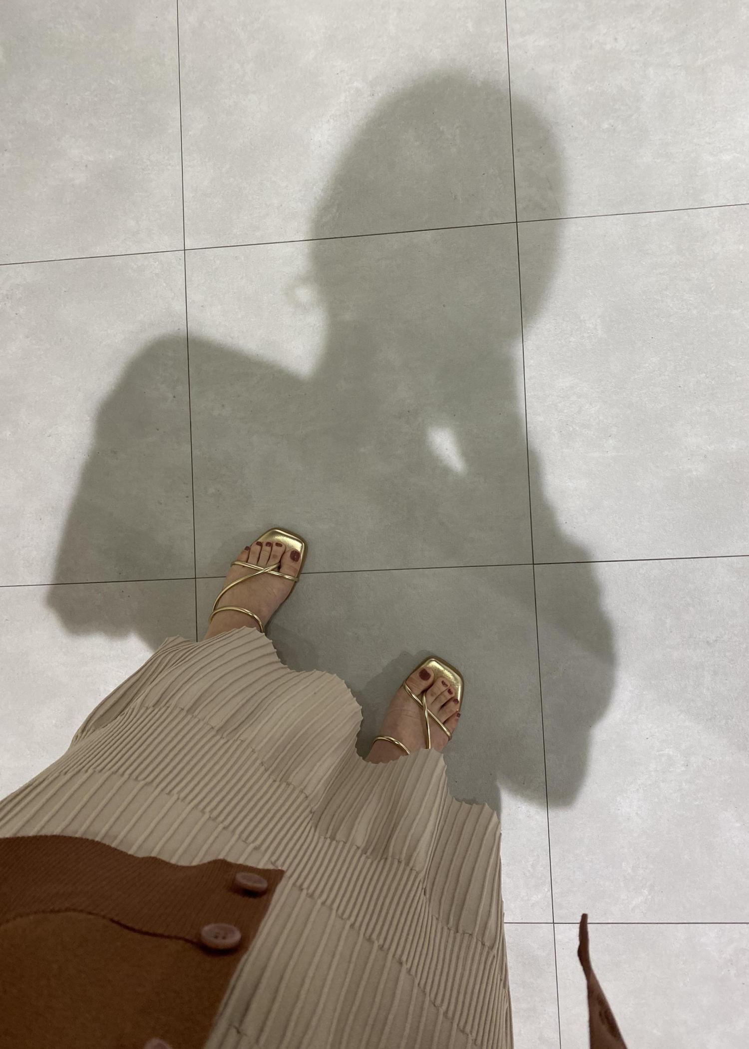 トレンドのベージュ系ワントーンにブラウンカーデをプラスしました。
