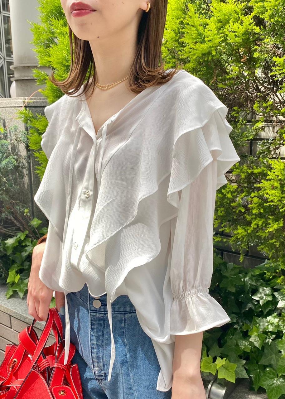 ボリューム感のある胸元のフリルが歩くたびゆらゆら動きが出てるので1枚で女性らしい印象に。