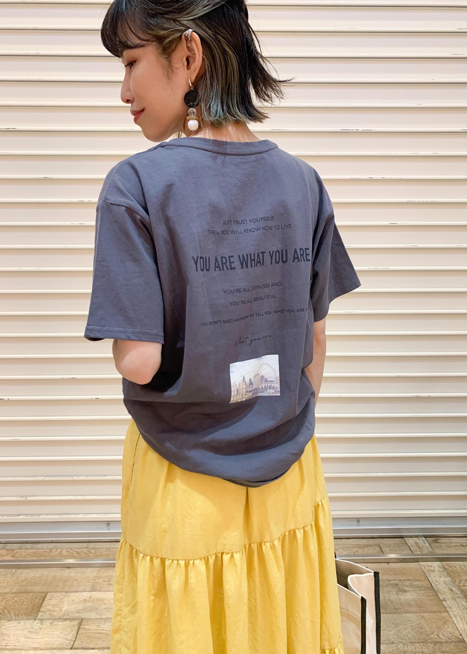 ロゴT×ティアードスカートの カジュアルコーデ。 スミクロにイエローを差し色にして、 あえてヒールで合わせ 女性らしい印象を意識しました。 夏に向けてリラックス感あるスタイルです♪ 低身長の方にもオススメです☺︎