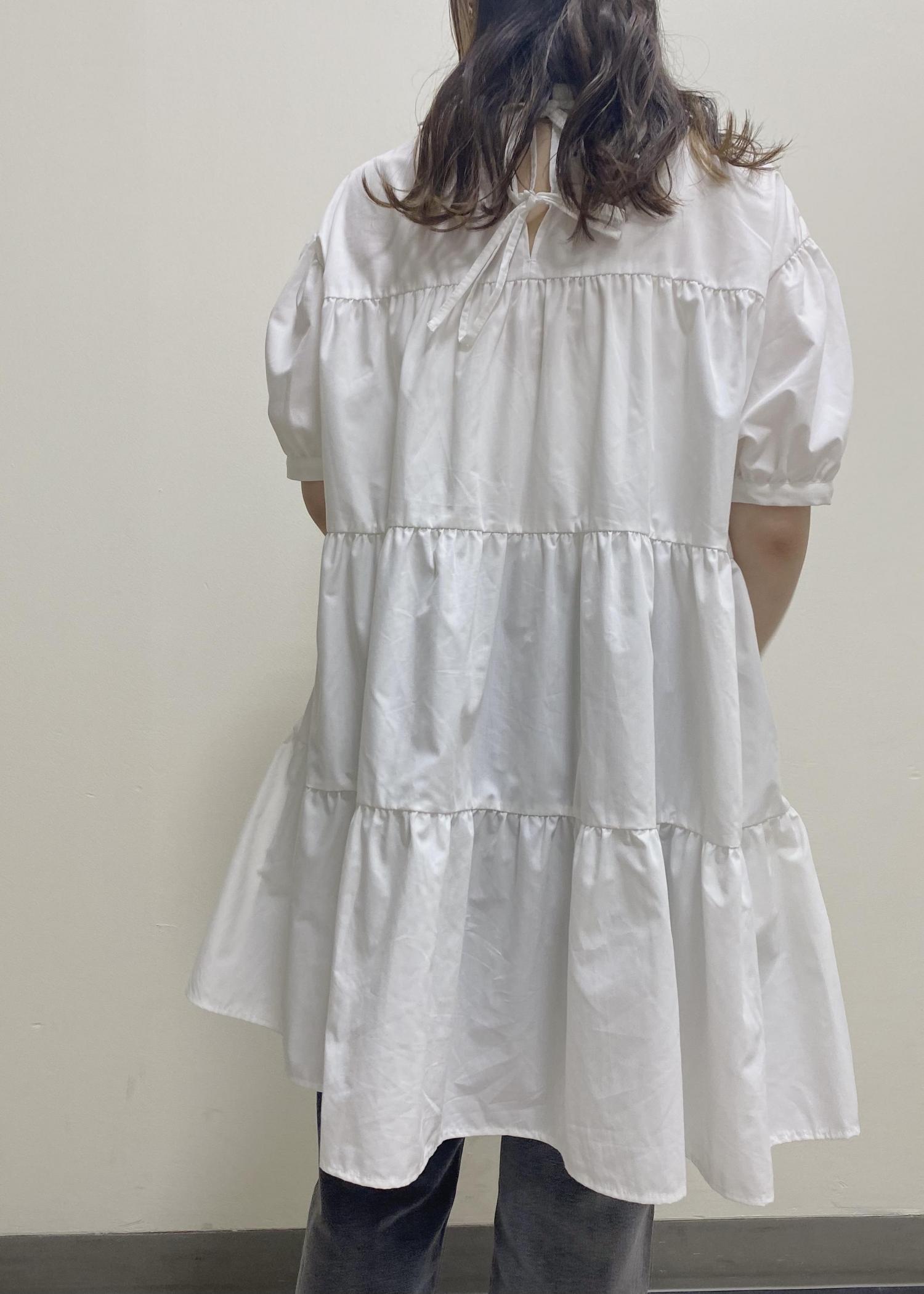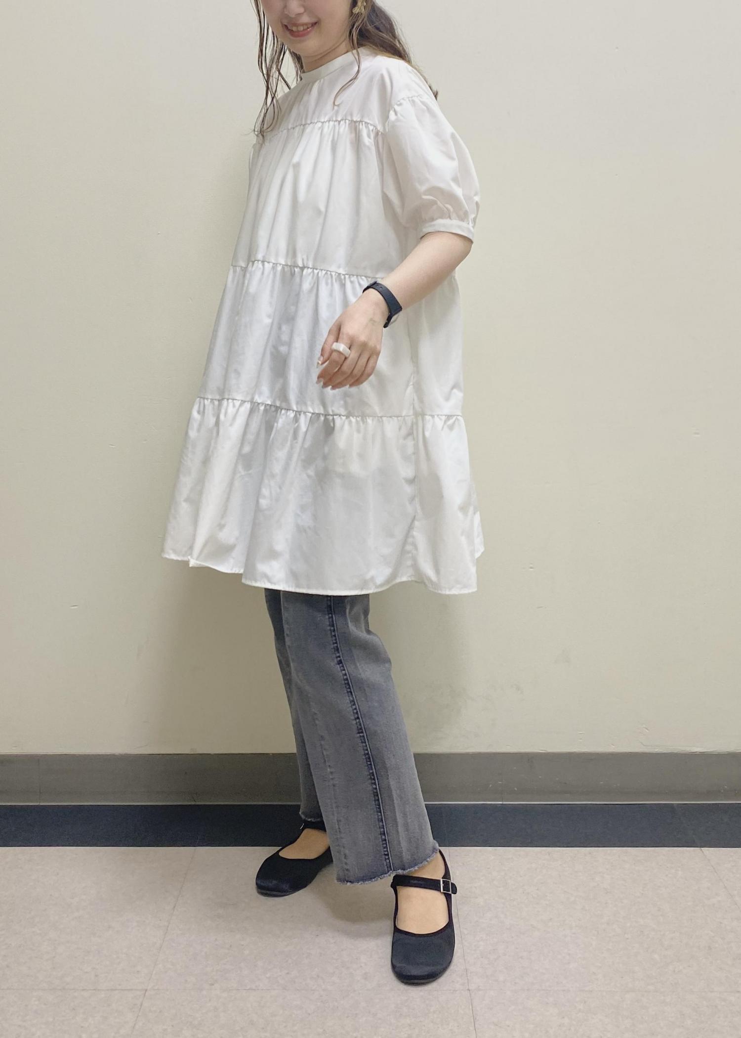 大人可愛いを叶えてくれるボリュームティアードデザインは広がりがあり着丈も長めなので、パンツスタイルで合わせてみました! パンツはストレートのデニムでシンプルながら、センターにあるハギにより脚長く見せてくれるデザインや裾のフリンジなどワンポイントが◎ Instagram @yui_vis