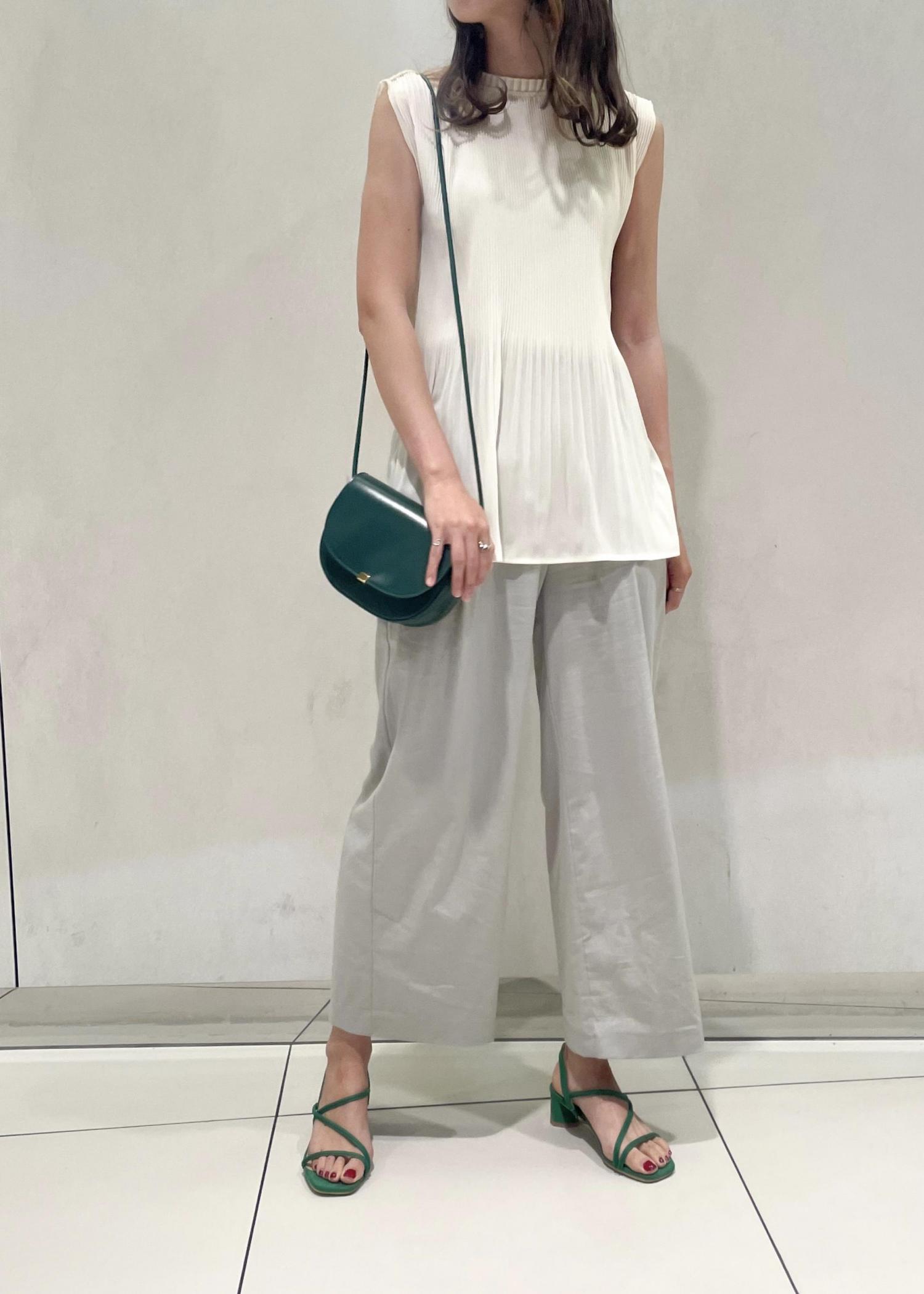 ペプラムブラウス×細見えワイドで女っぽさを残しつつもリラックスした着心地で、着やすさバツグンです◎