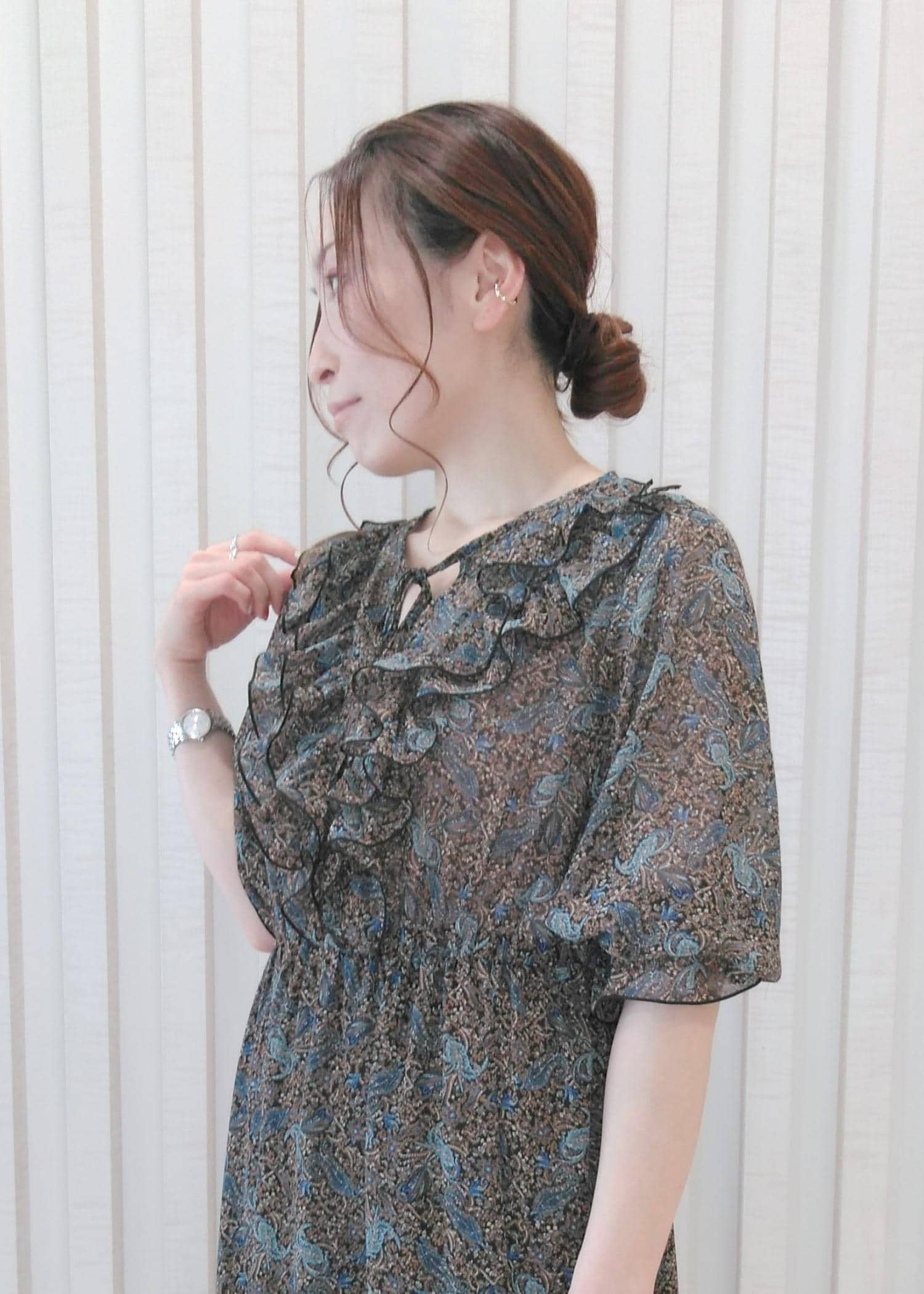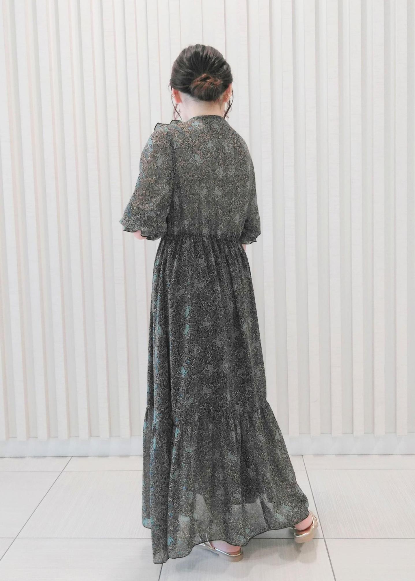 華やかなデザインのワンピースに、リゾート感のある小物を合わせました。 かごバッグはエコレザー素材のもの、フラットサンダルは色をゴールドにし、タウンユースにも丁度良い抜け感を出しています。