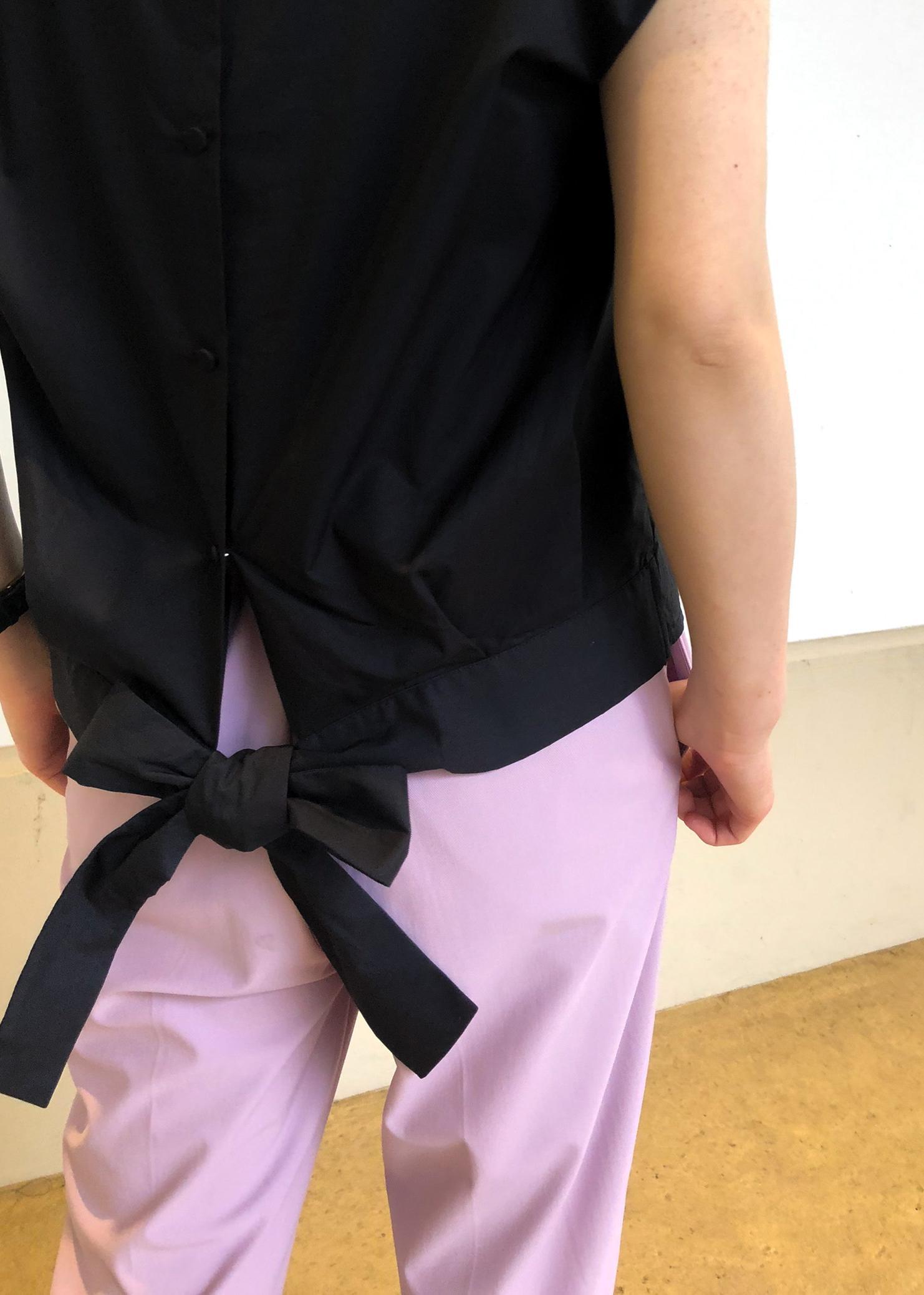 黒を基調にきちんと感を出しつつも、指し色でパンツにピンクを取り入れてみました!パンツのデザインはセンタープレスが入りこちらも綺麗めな印象に見えるパンツです!バックスタイルはリボンがついて少し遊び心があるデザインです!お仕事や普段のお出かけにおすすめなコーディネートにしてみました!