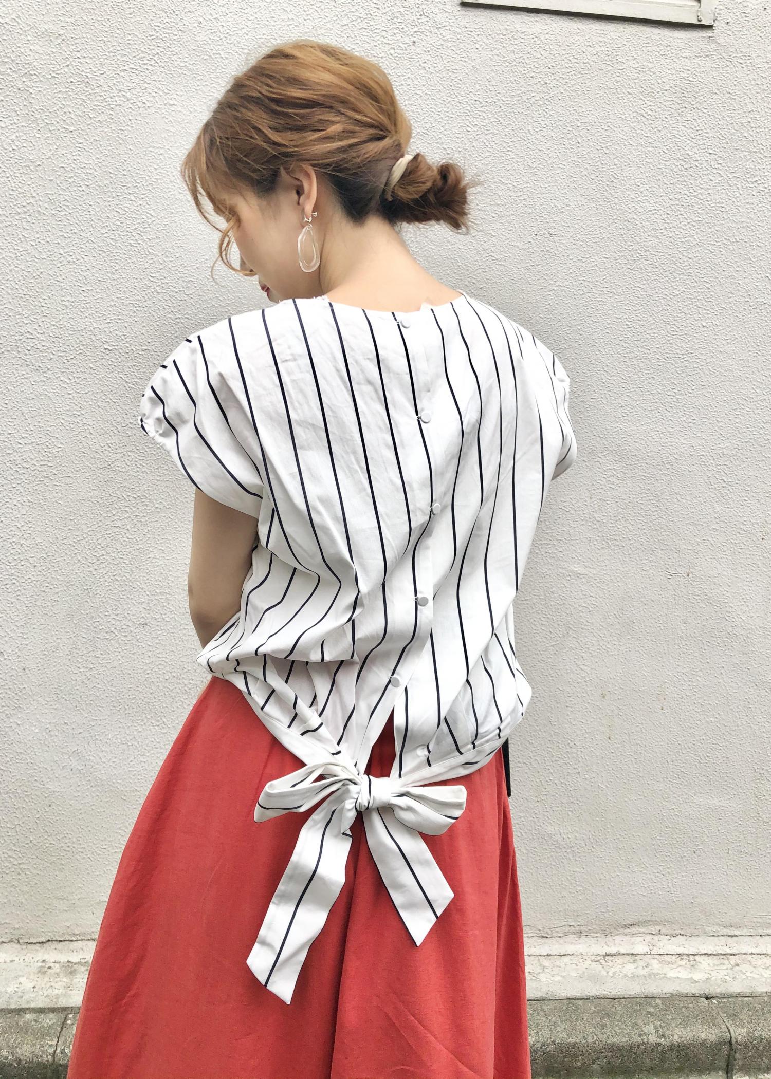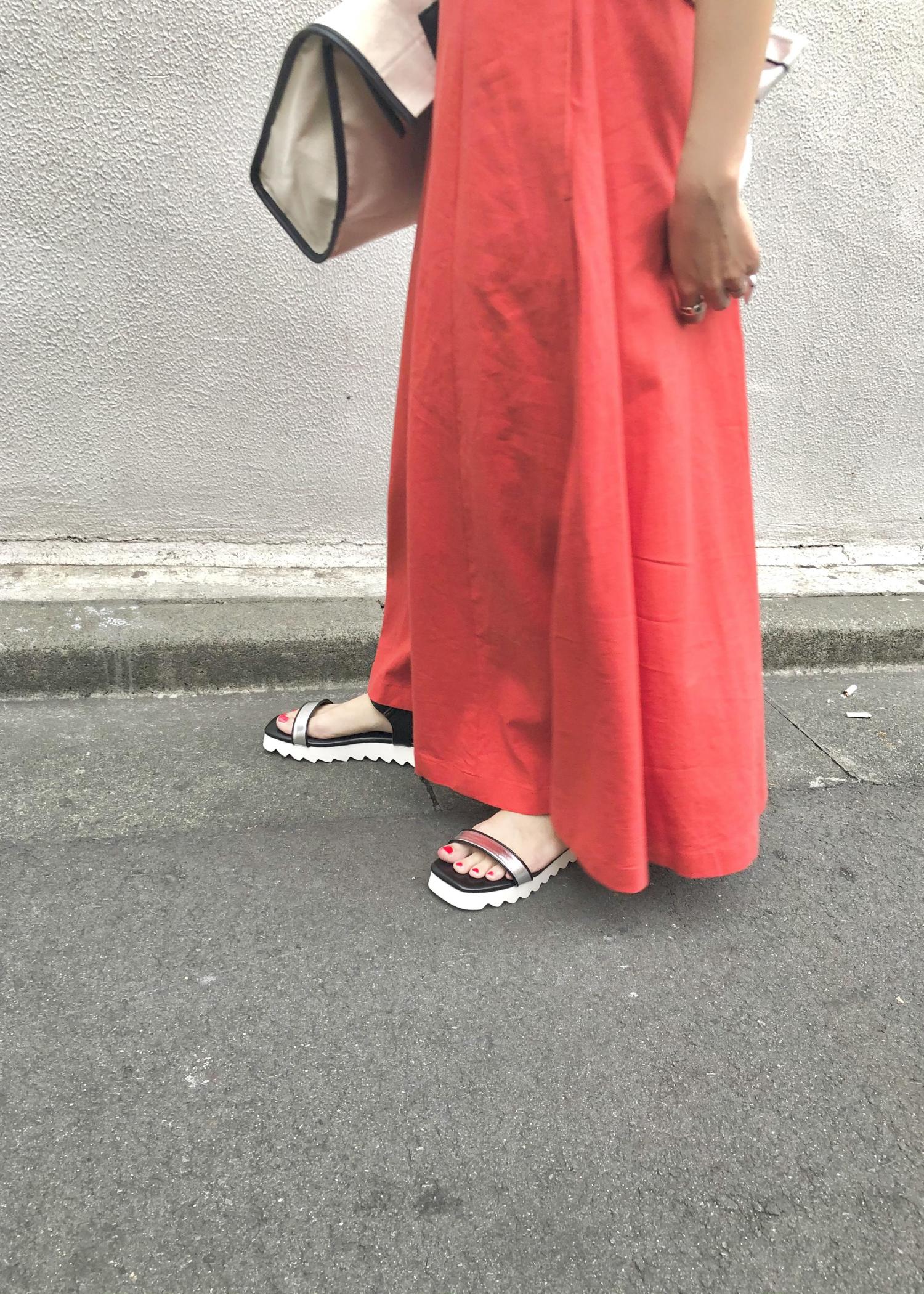 パキッとした赤色のスカートが一気に夏らしさを演出してくれます。