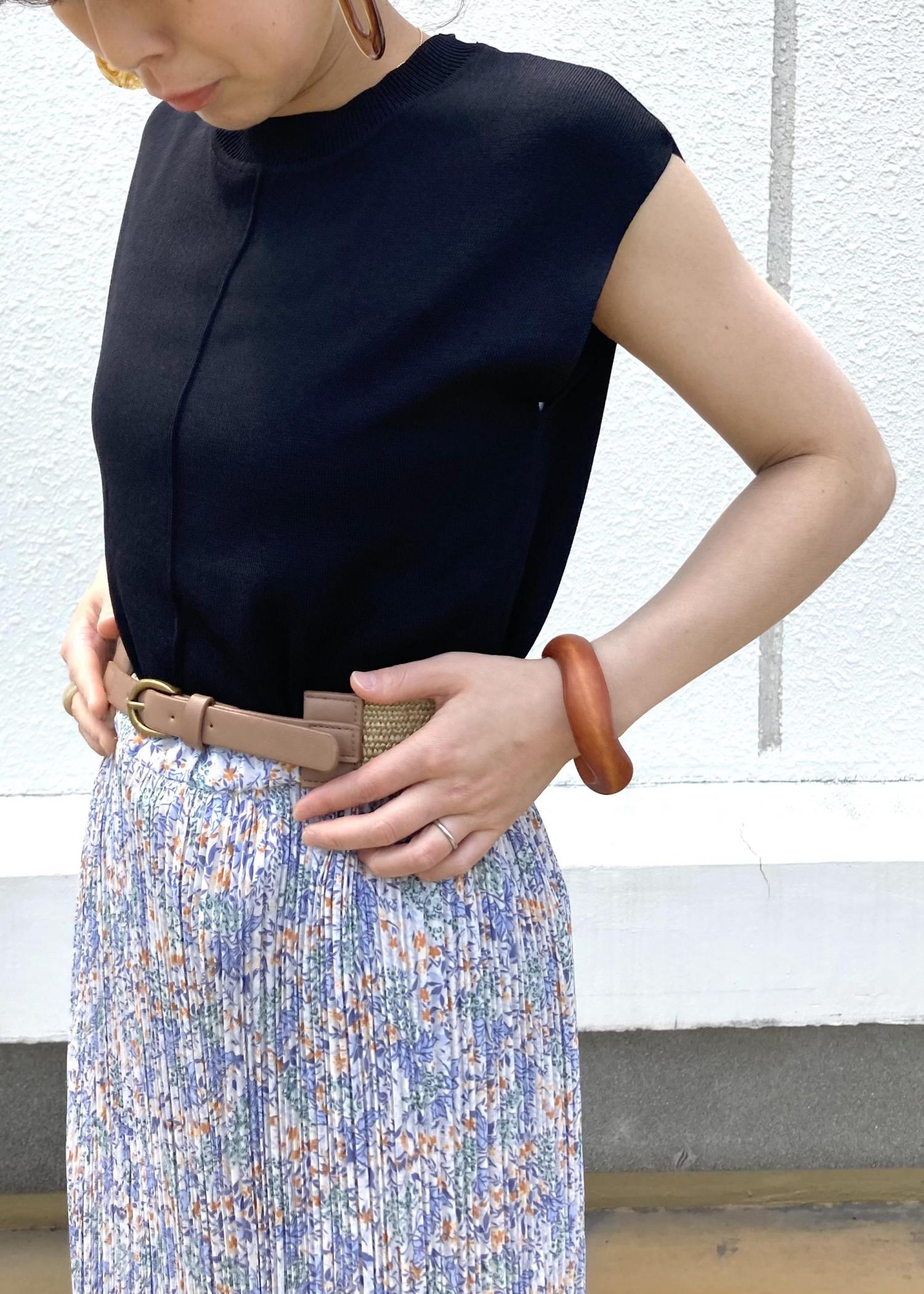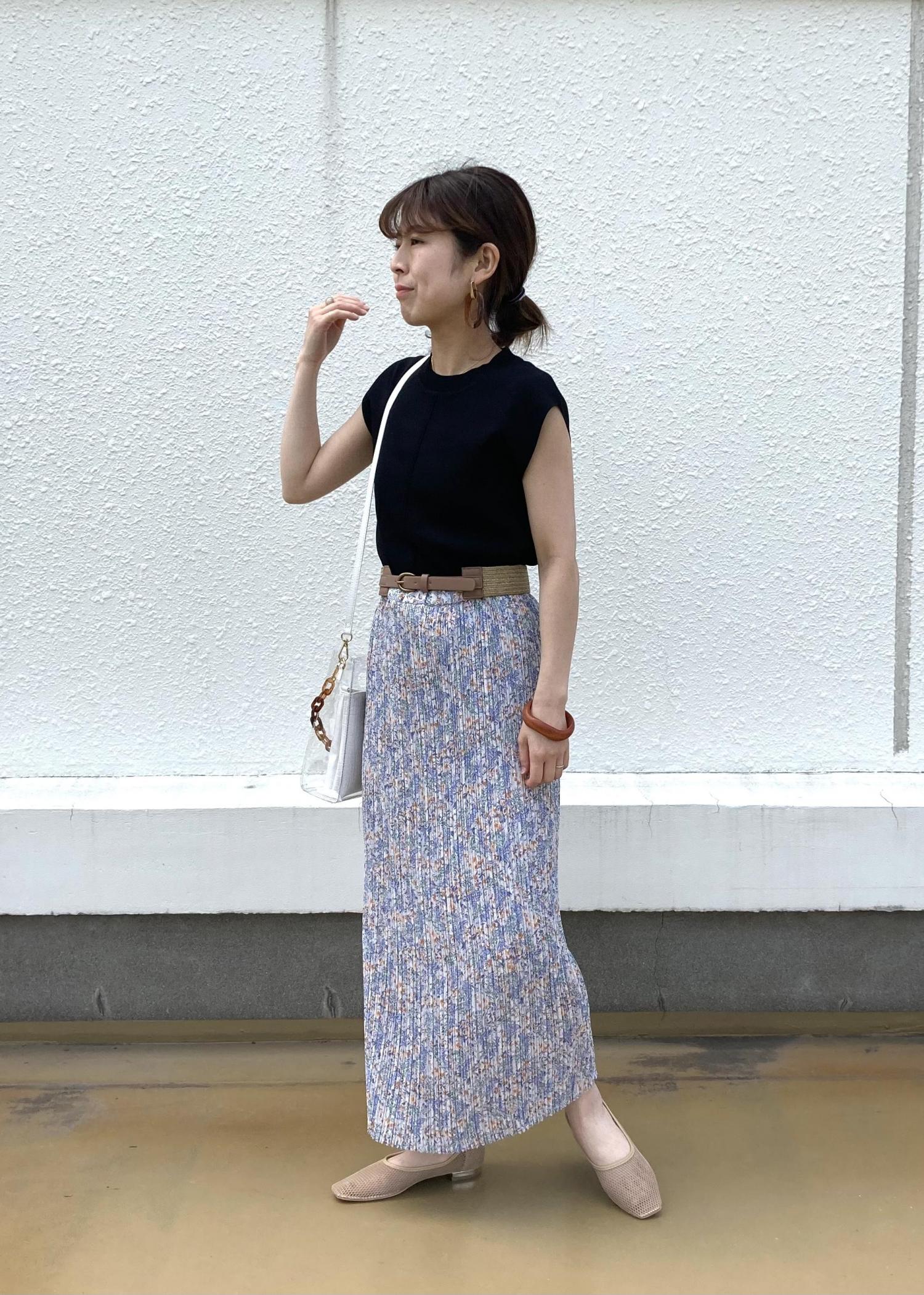 黒のニットも淡めカラーの花柄スカートと合わせれば