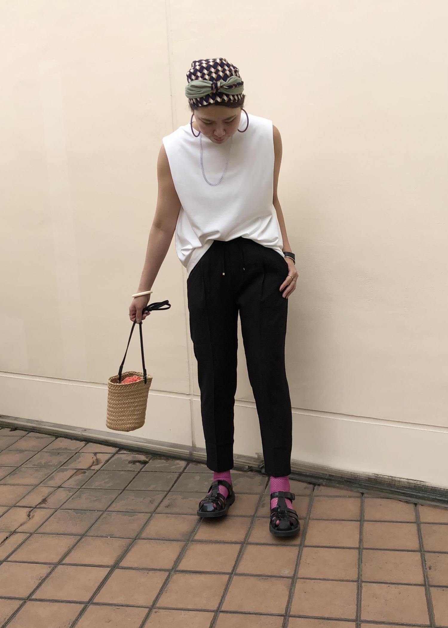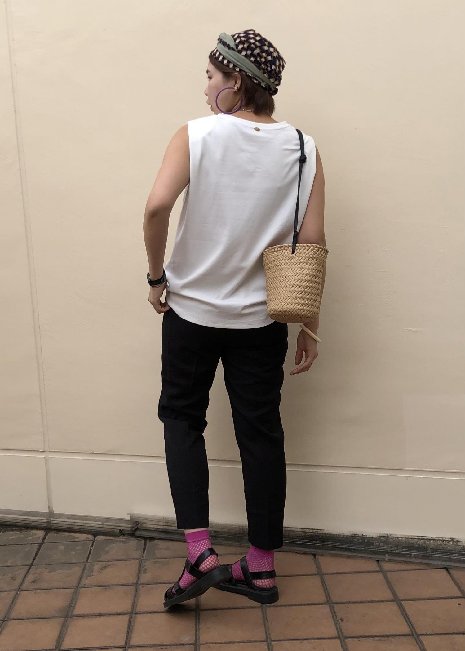 モノトーンに柄やカラーの小物でポイントに!! きれい目になり過ぎないようにしてみました♪