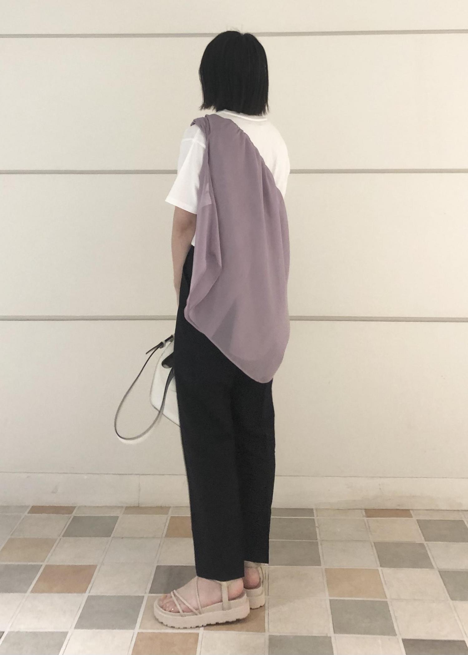 たすき掛けにしたパープルのシャツでシンプルなモノトーンのコーデにアクセントを!