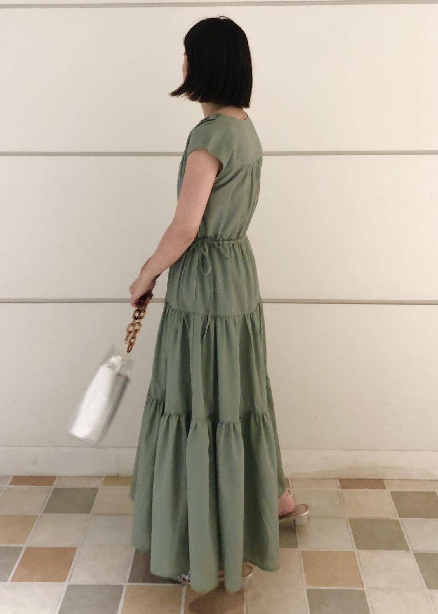 鮮やかなグリーンが目を引くフレンチスリーブのワンピースです。