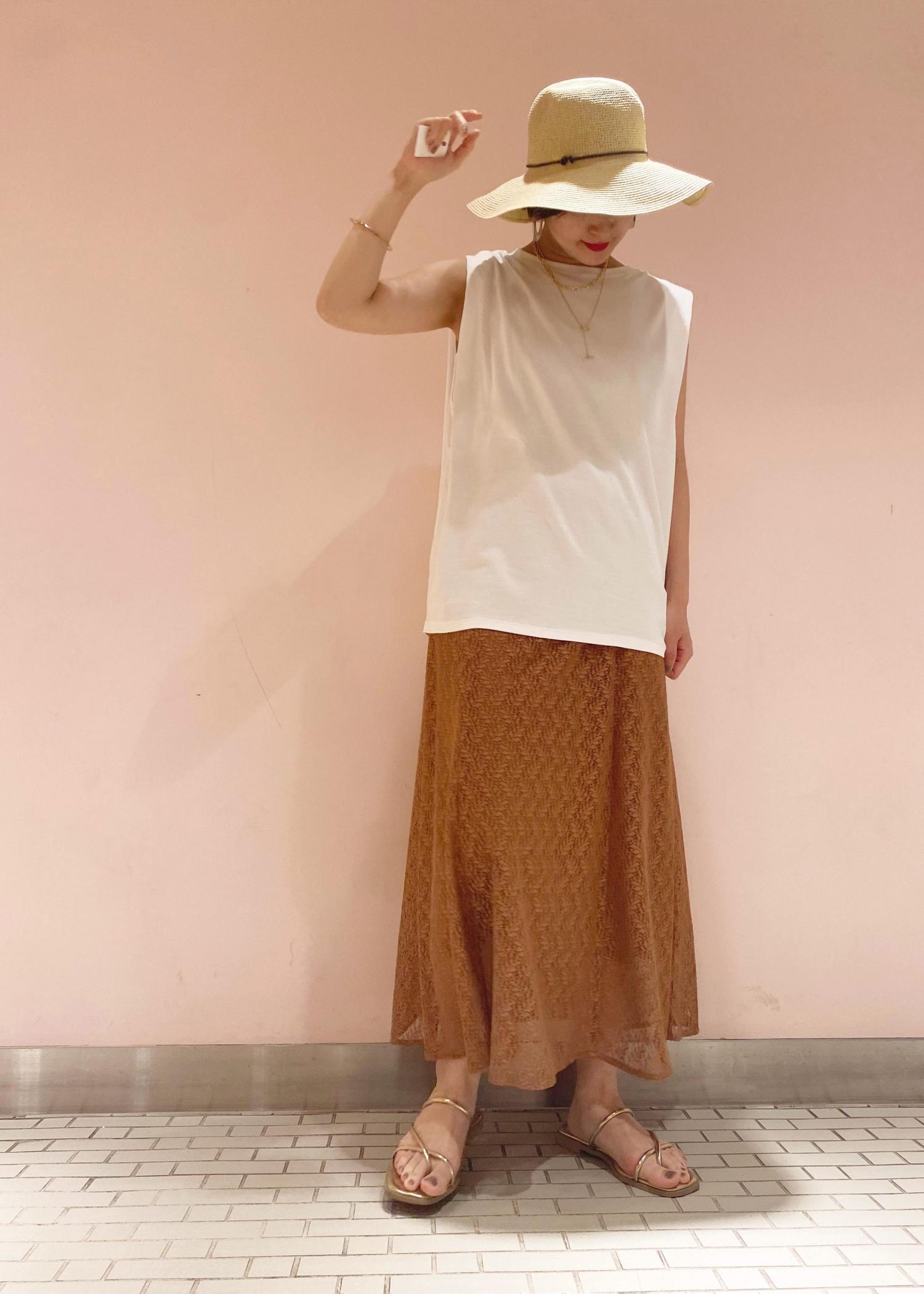 シンプルだけど、さり気なくオシャレにコーディネートしたいときにおすすめの組み合わせです! ゴールドのサンダルにネックレス・バングルを同じゴールドにまとめると統一感もでますよ。
