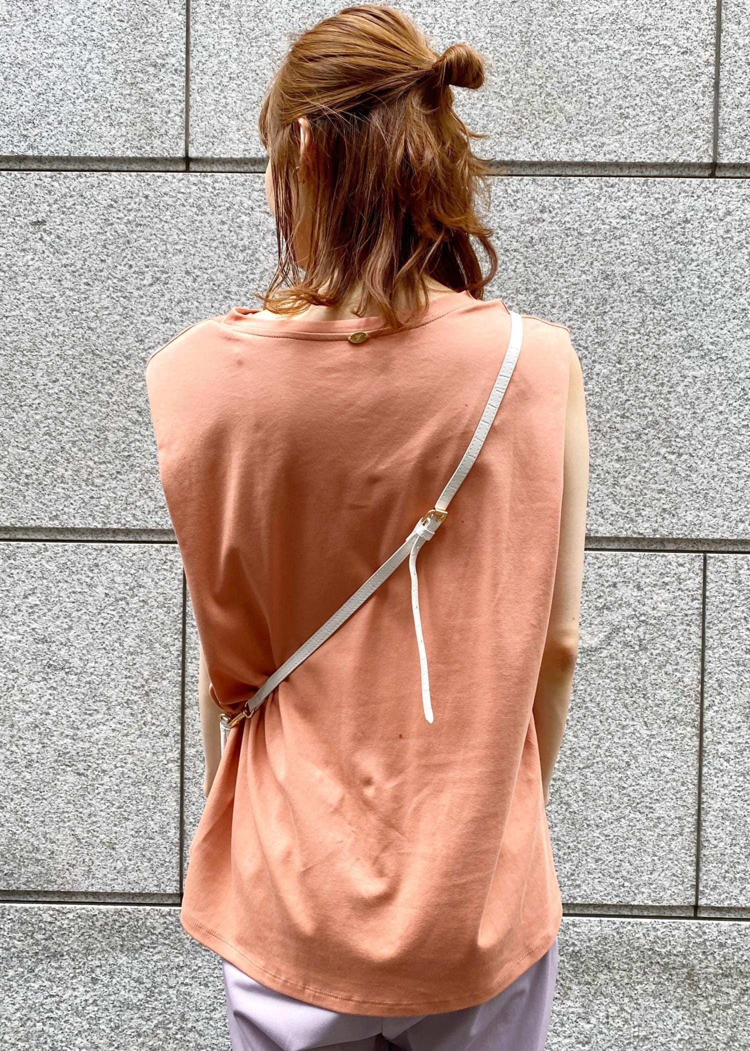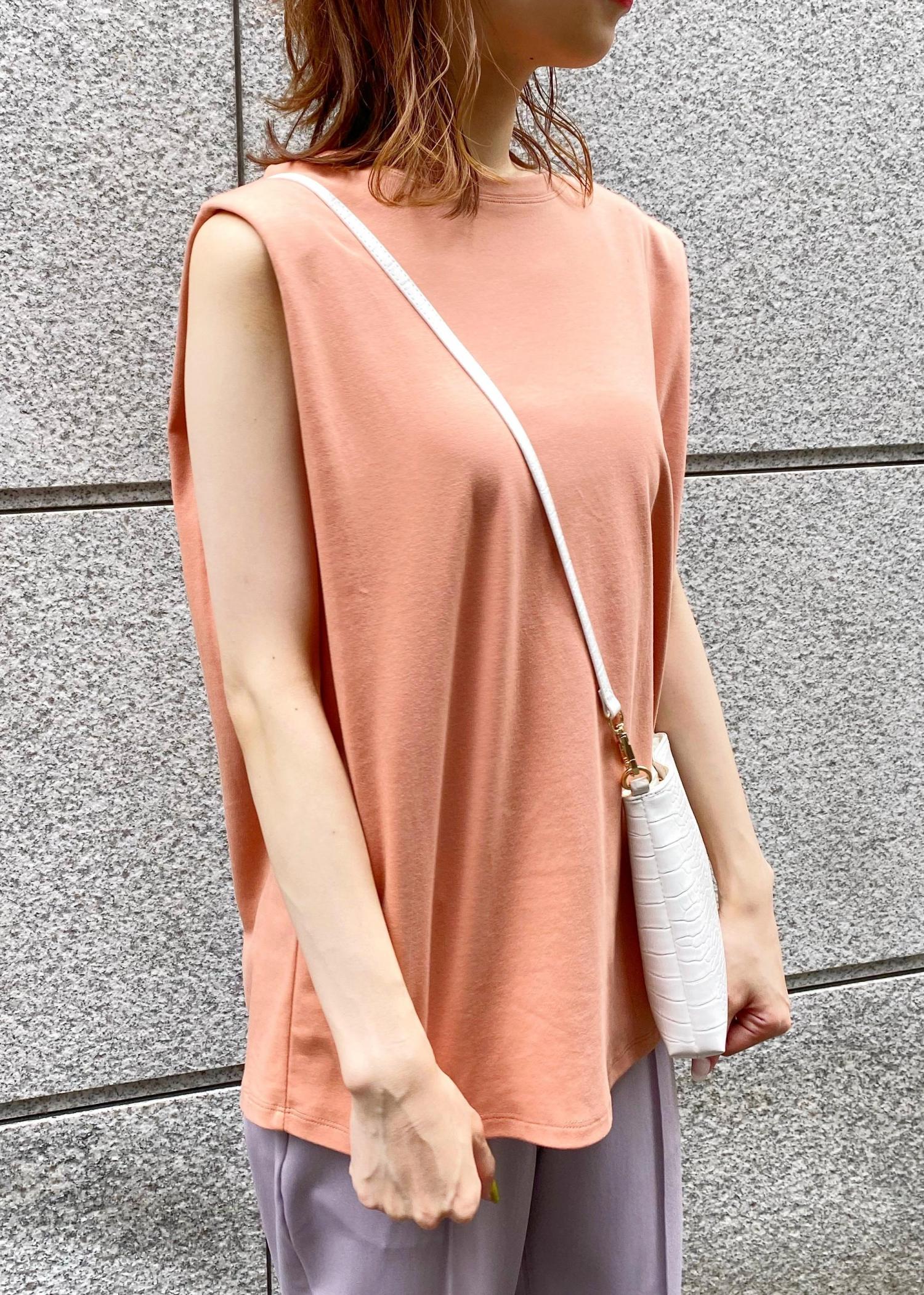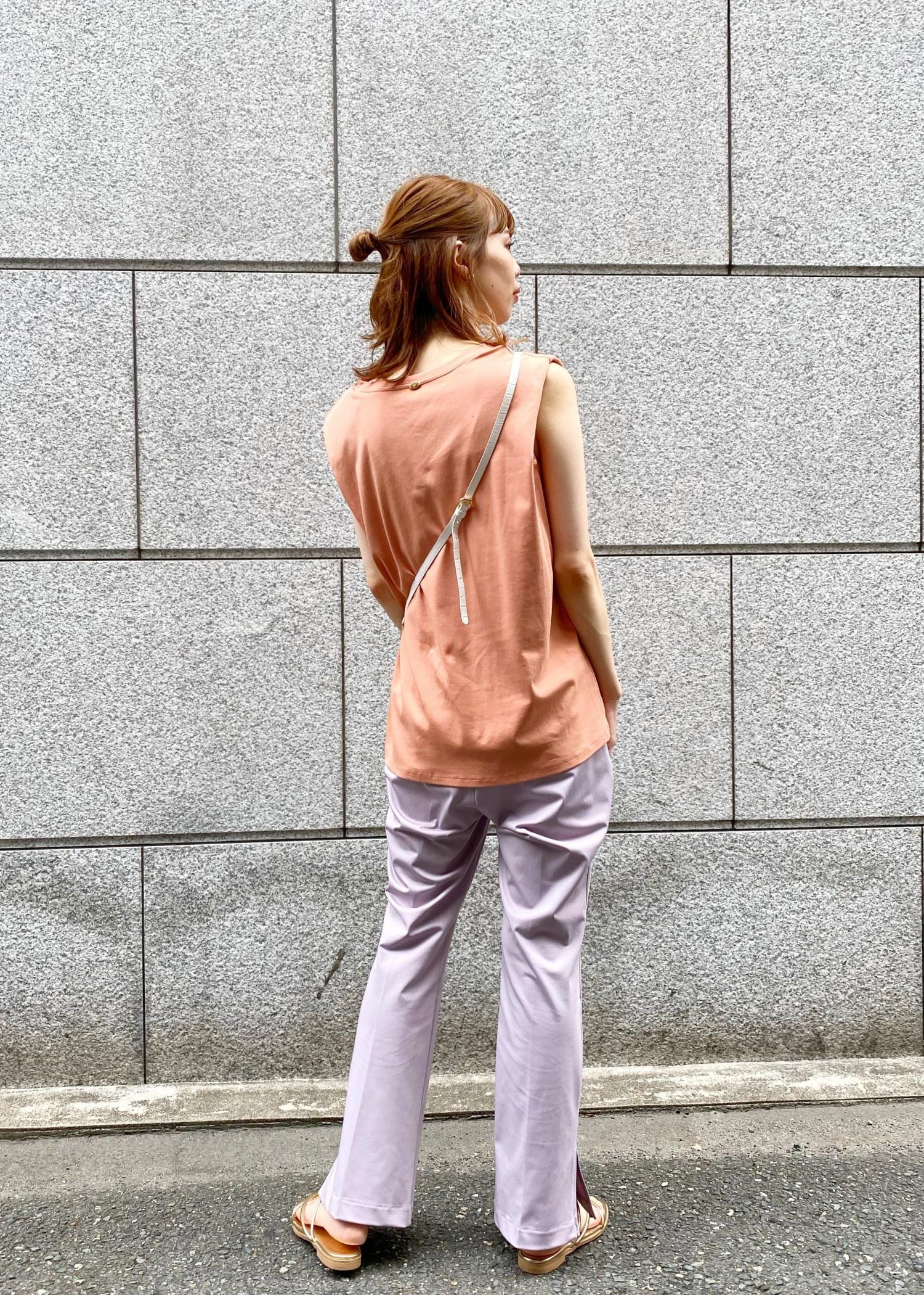 オレンジ×ピンクのカラーコーデ。 カラー合わせは派手なイメージがありますが、落ち着いたトーンのオレンジカラーなので肌馴染み良く、カラーボトムとの相性◎ 小物はゴールドと白でまとめ女性らしい印象にしました♩