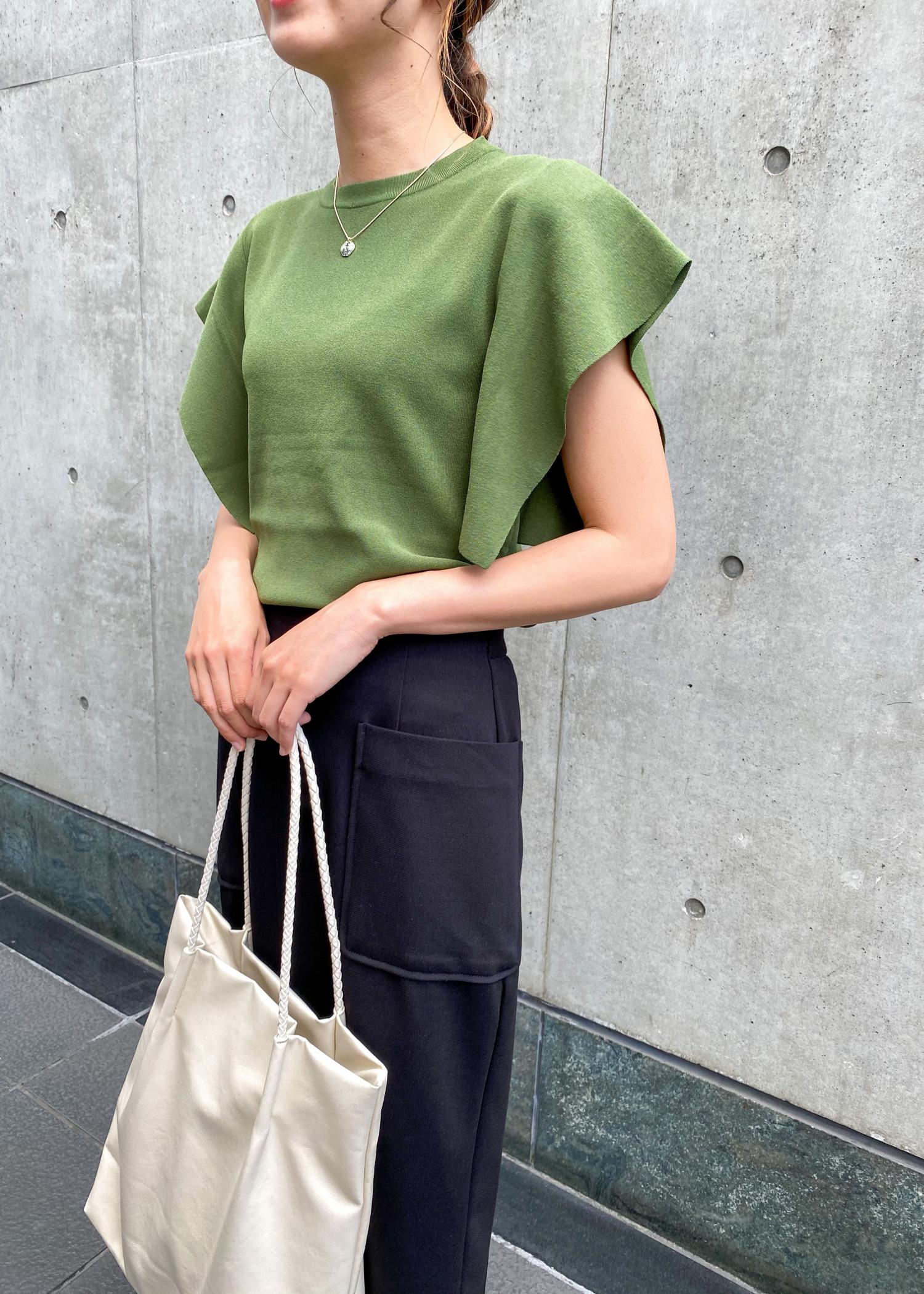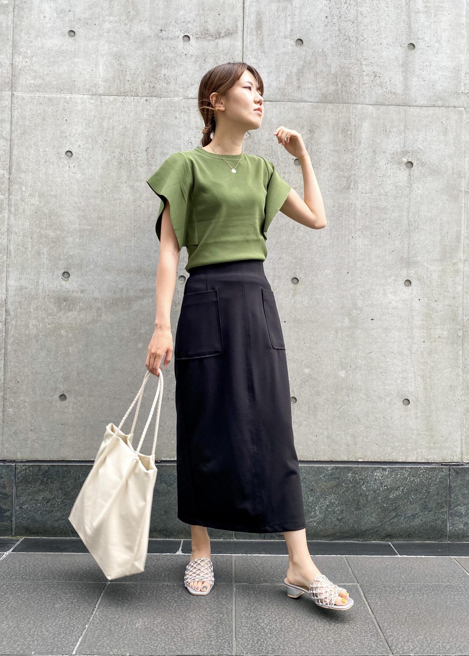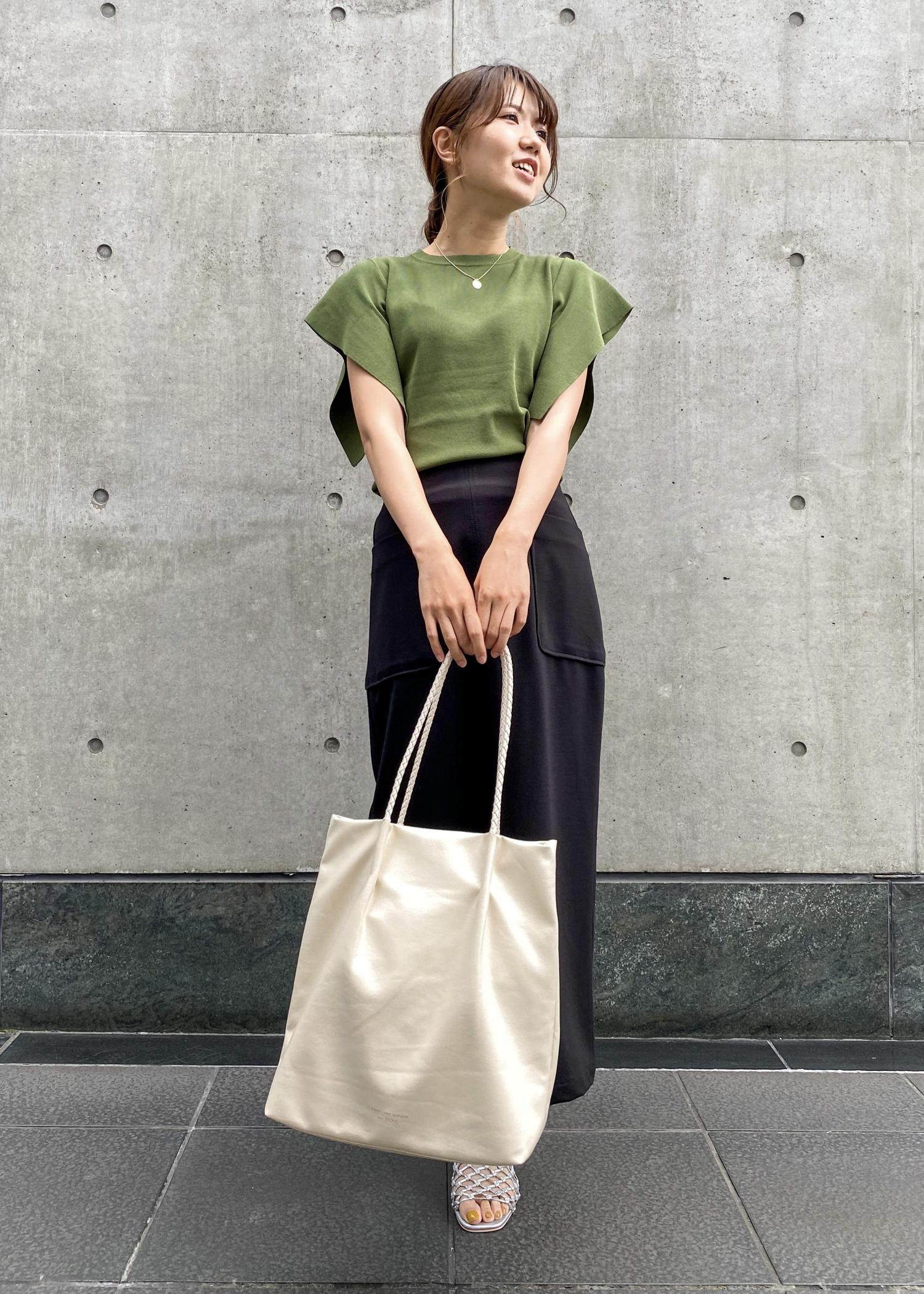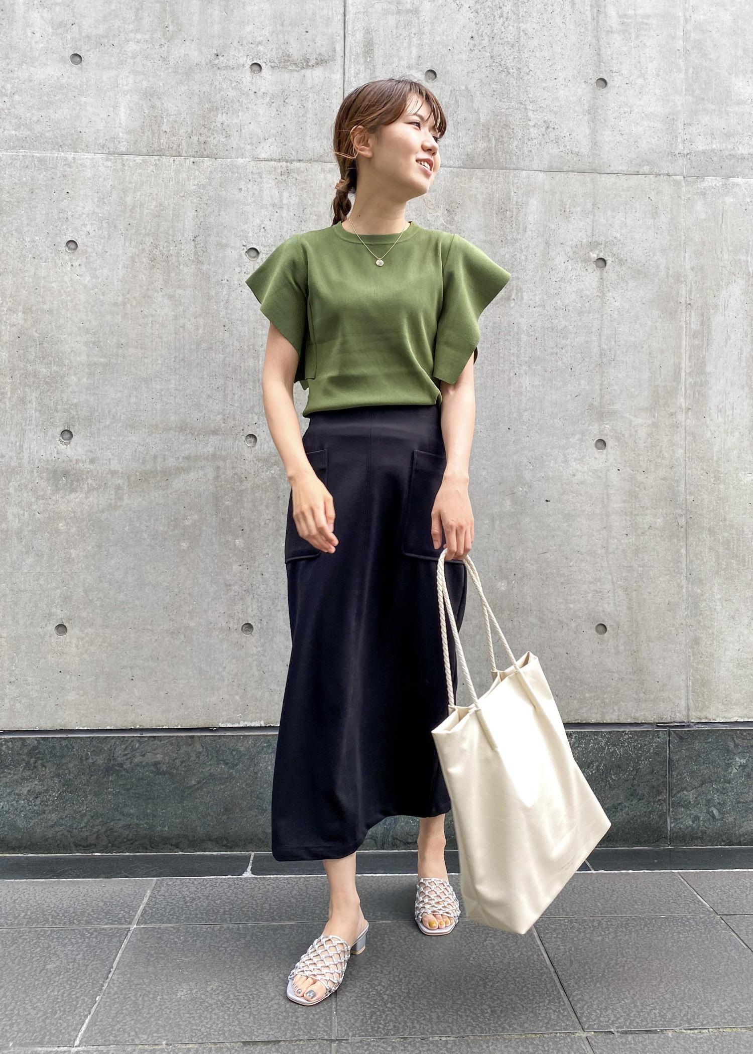 トップスのグリーンをポイントに、ボトムや小物の色はすっきりと見えるようにベーシックカラーで統一すると、カラーが映えてコーディネートにまとまりが出るのでおすすめです◎
