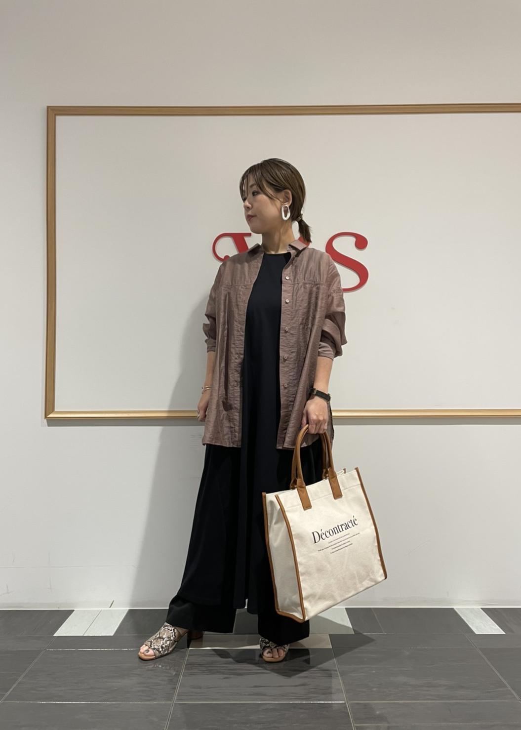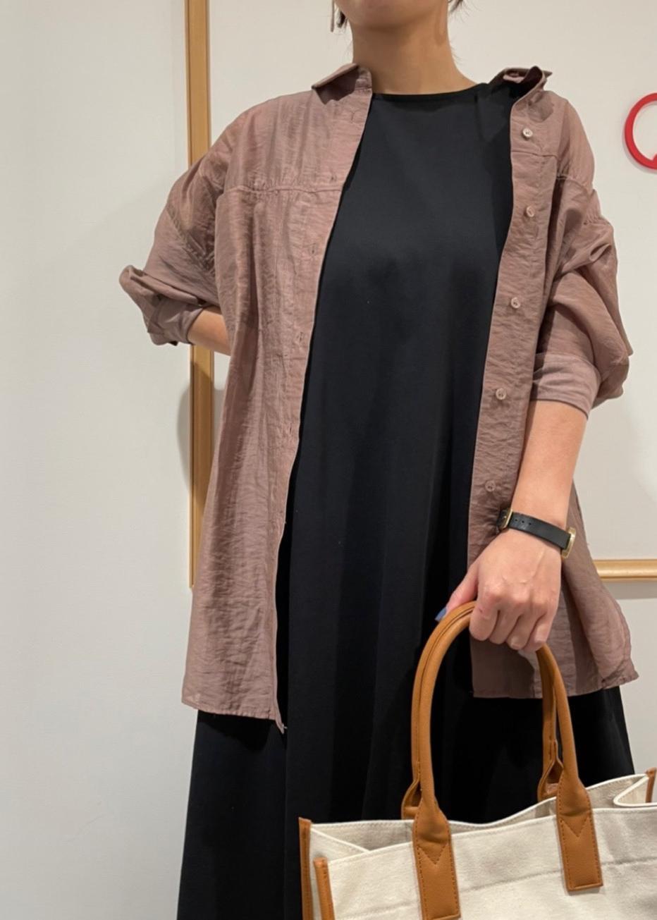 ゆったりとしたワンピースにシアーシャツを合わせて