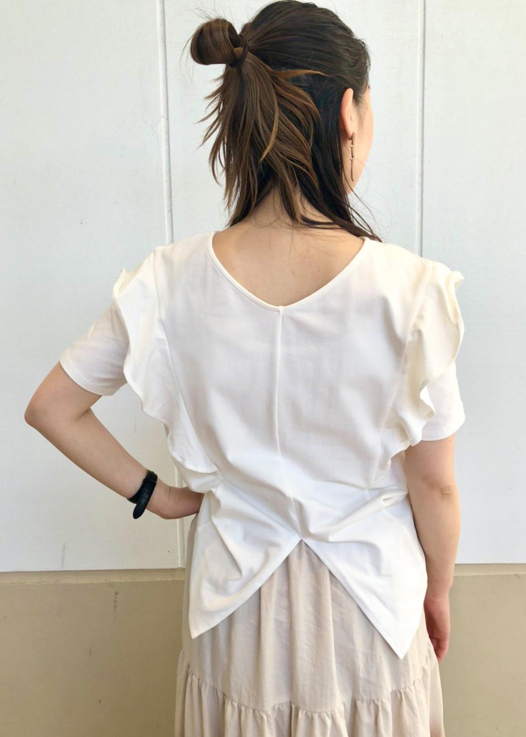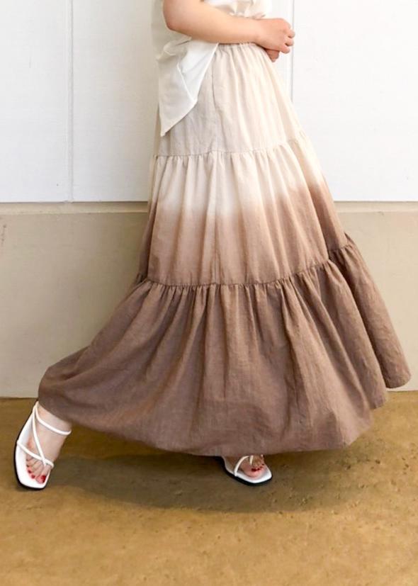 トップスのカラーをスカートに合わせて、上から下にかけて全身がグラデーションになるように合わせてみました!白の爽やかさから徐々にサマーダークなブラウンに変わるのがポイントです!