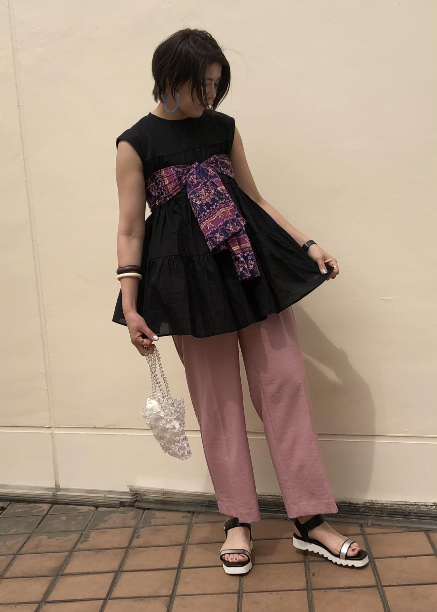可愛らしい印象のティアードチュニックもカラーをブラックにすると甘さ控えめに!! スカーフをビスチェ風にアレンジしてシンプルコーデのポイントにしました♫ 軽やかに着用できる素材感で暑い夏も乗り切れそうです☺︎