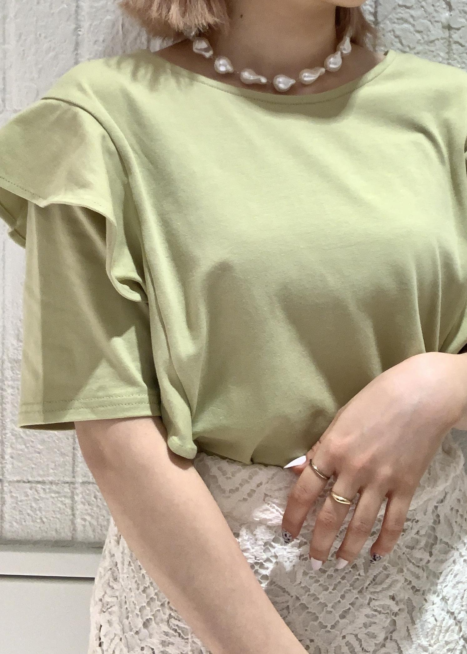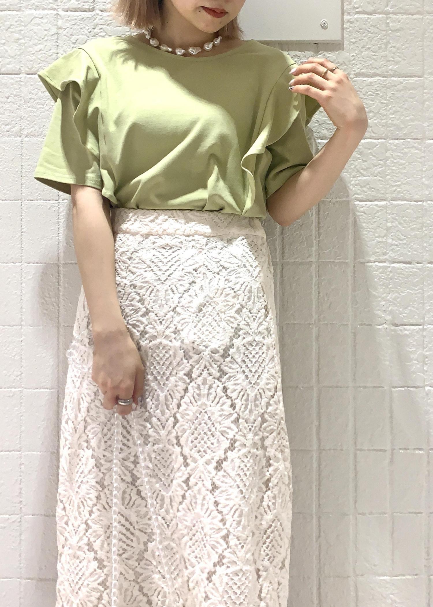 今年らしいグリーンを使用したコーディネート! 大きめのフリルが顔まわりを華やかにしてくれ、小顔効果もありです。 甘めのフリルのトップスに、女性らしいレーススカートを合わせて甘さを抑えています。