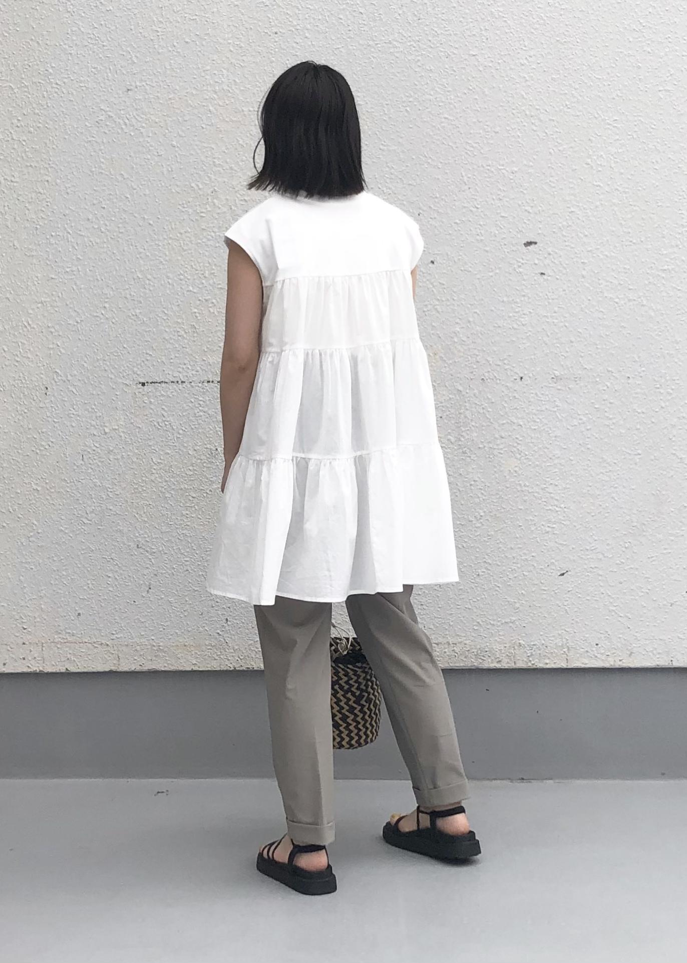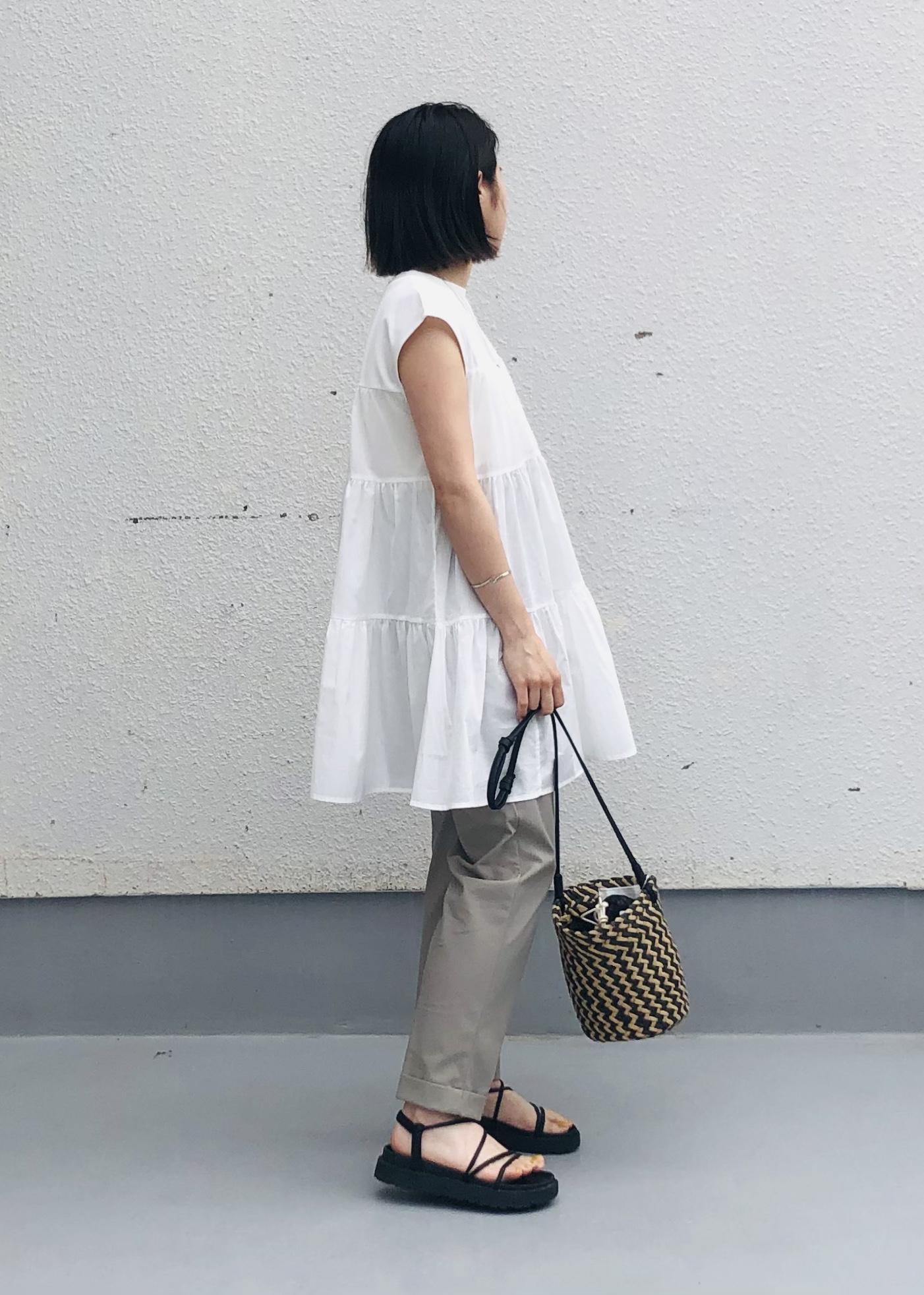 今年らしいティアードカットソーにテーパードパンツを 合わせたカジュアルすぎないコーディネート。 ボトムはテーパードパンツでスッキリとした印象に! 小物は雑材やサンダルで夏らしくまとめました。 淡いカラーはブラックで締めて着るのが◯