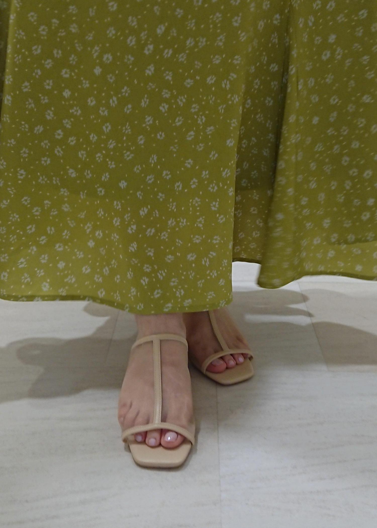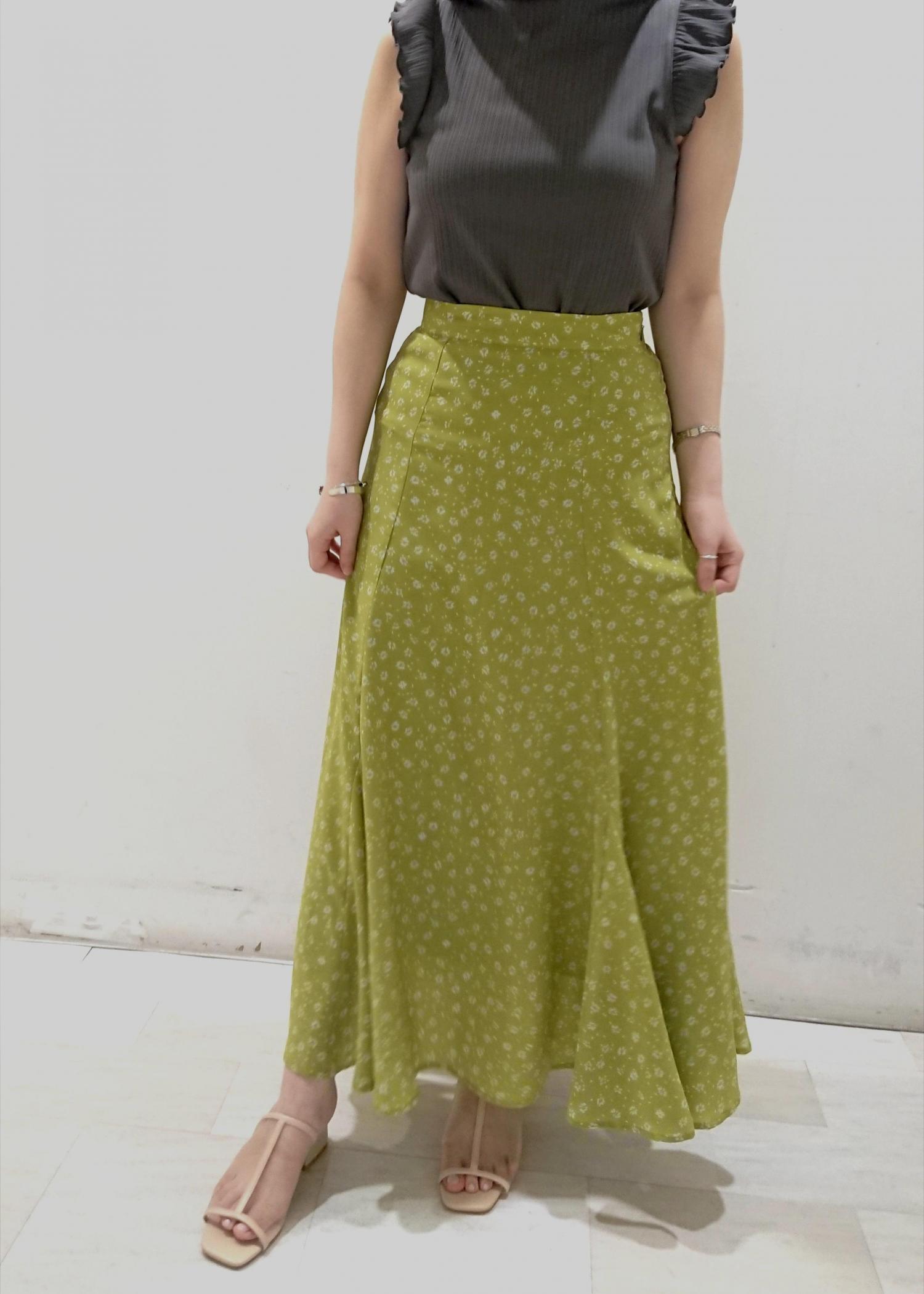 鮮やかなグリーンの花柄スカートを主役にしたスタイリングです。 トップスは真っ黒ではなく、チャコールグレーを合わせることで色馴染み良く、グリーンがしっかりと映えるコーディネートにしました。 羽織のカーディガンとサンダルは透け感のあるものを合わせてトレンド感と季節感を♪