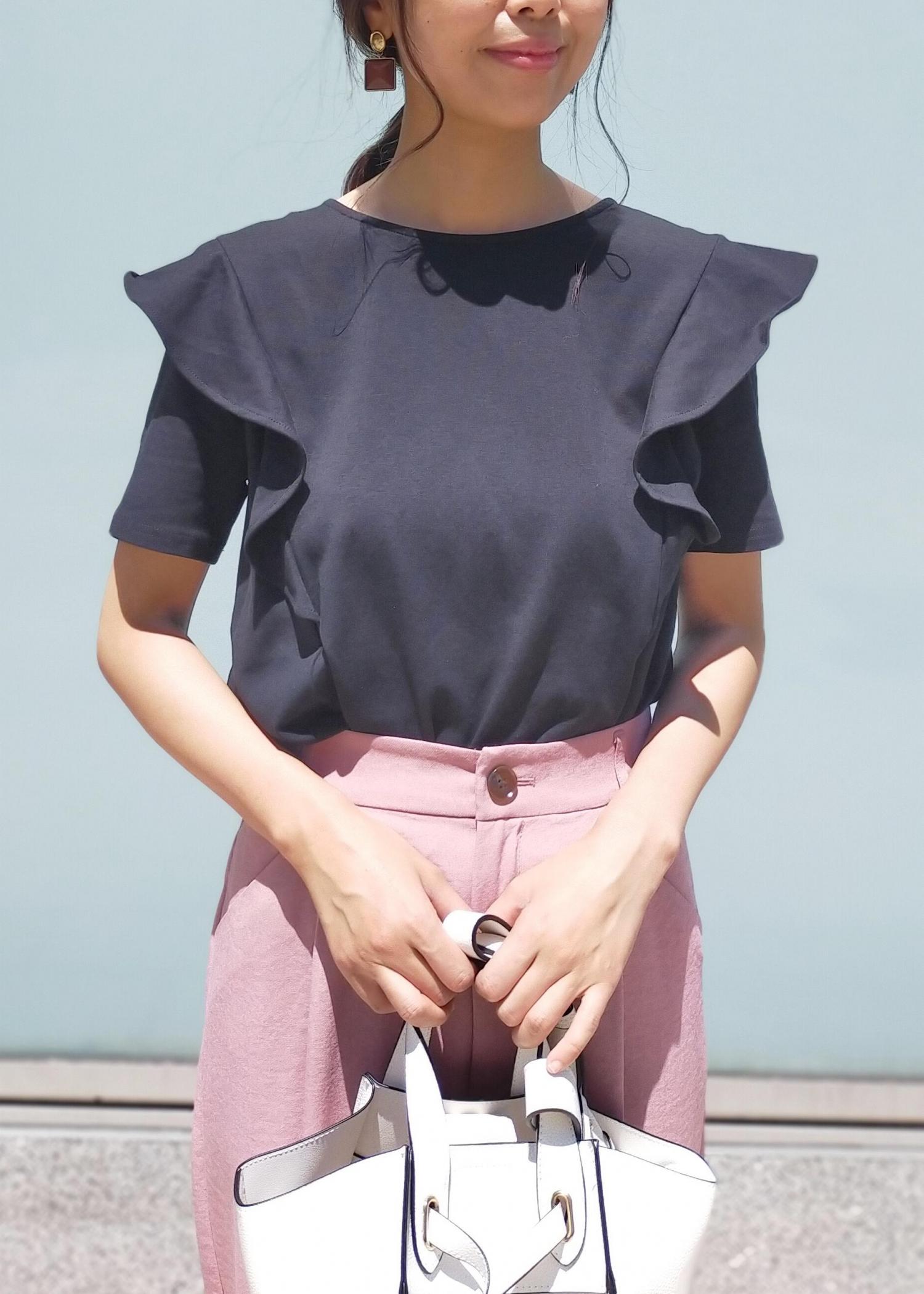 フリルトップスはフリル部分が控えめで、可愛いのに甘すぎないのがポイント☆