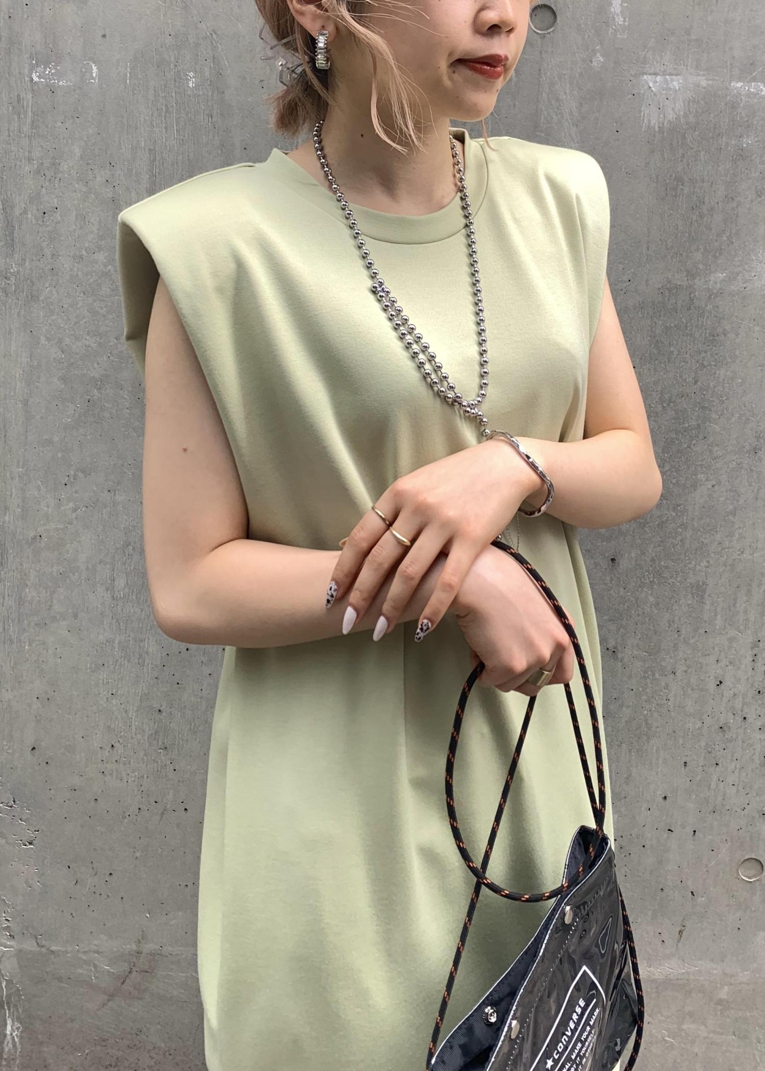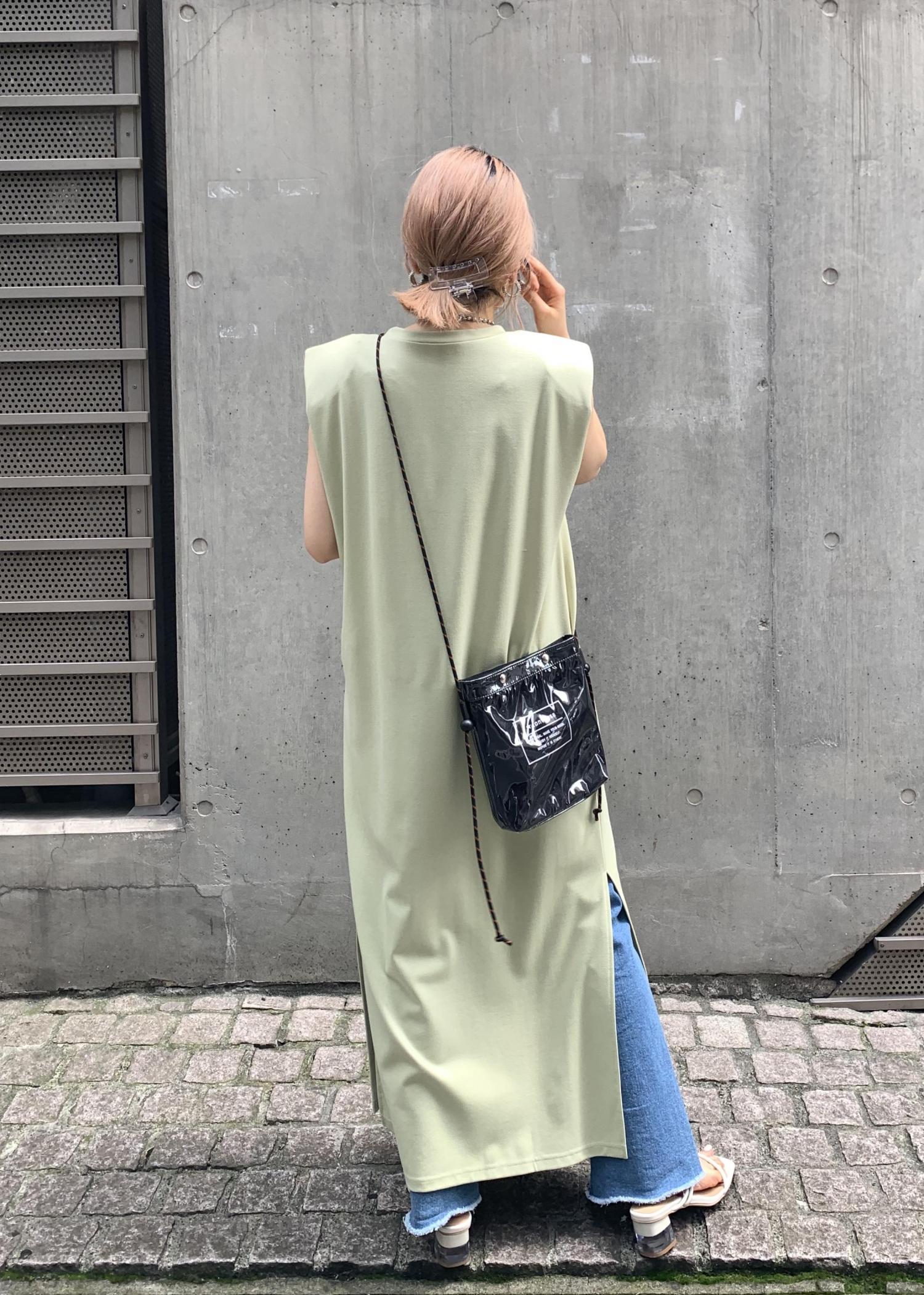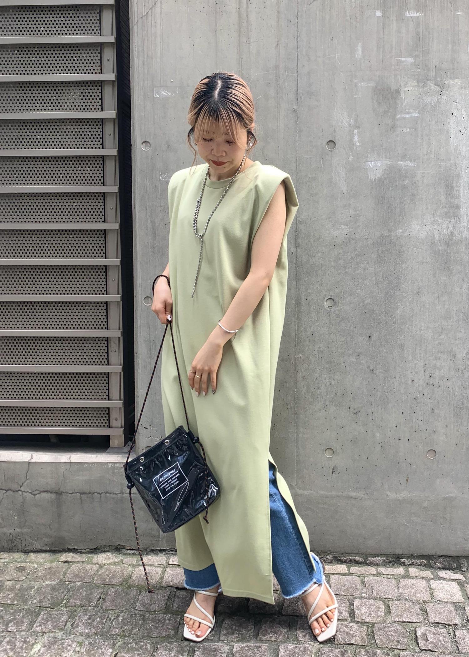 まろやかなグリーンが華やかなワンピース! 柔らかい肩パットが入っているので立体感をだしてくれ、正面から見た時に二の腕をすらっと細く見せてくれます。 サイドにざっくりスリットが入っていてパンツをレイヤードするのもおすすめなので、デニムを合わせてカジュアルコーデにしています。 足元は、今年らしいナローストラップのクリアサンダルを合わせて、抜け感を出しています。