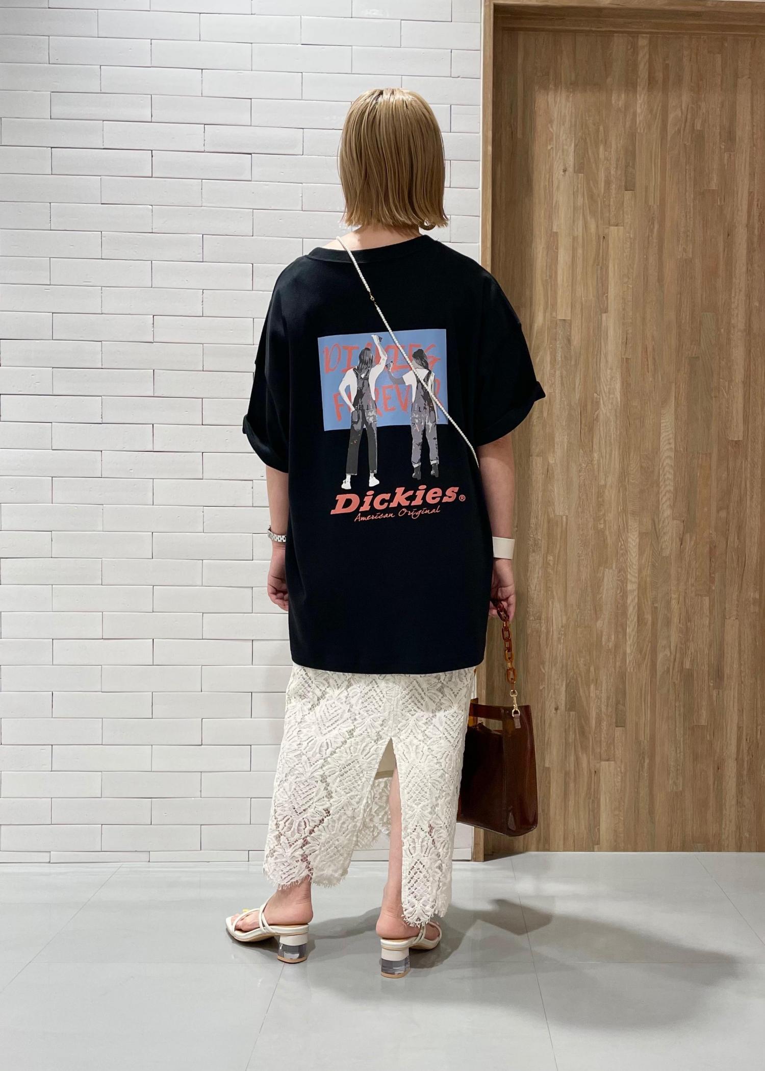 オーバーサイズのプリントTシャツを、あえてフェミニンなレーススカートを合わせる事で、いつものラフなTシャツスタイルから脱却!