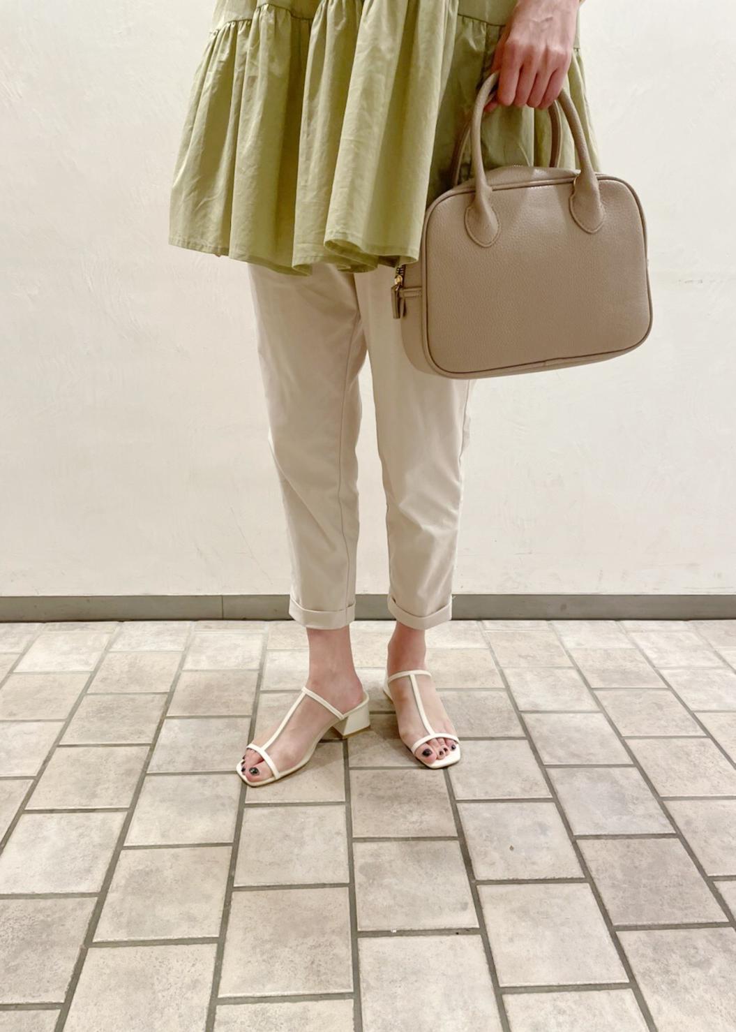 なにかとボリュームや甘さが出やすいティアードのデザインですが、 このコーディネートはピスタチオカラーが効いておりスッキリ見えます。 カジュアルに合わせたい方は定番のデニムで合わせてもティアードのデザインが引き立って可愛いですよ。