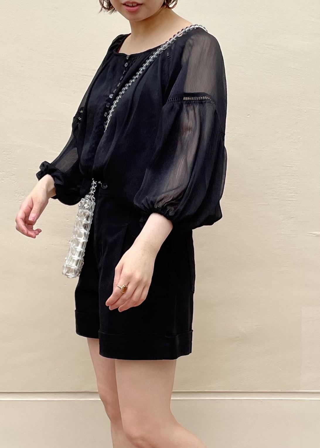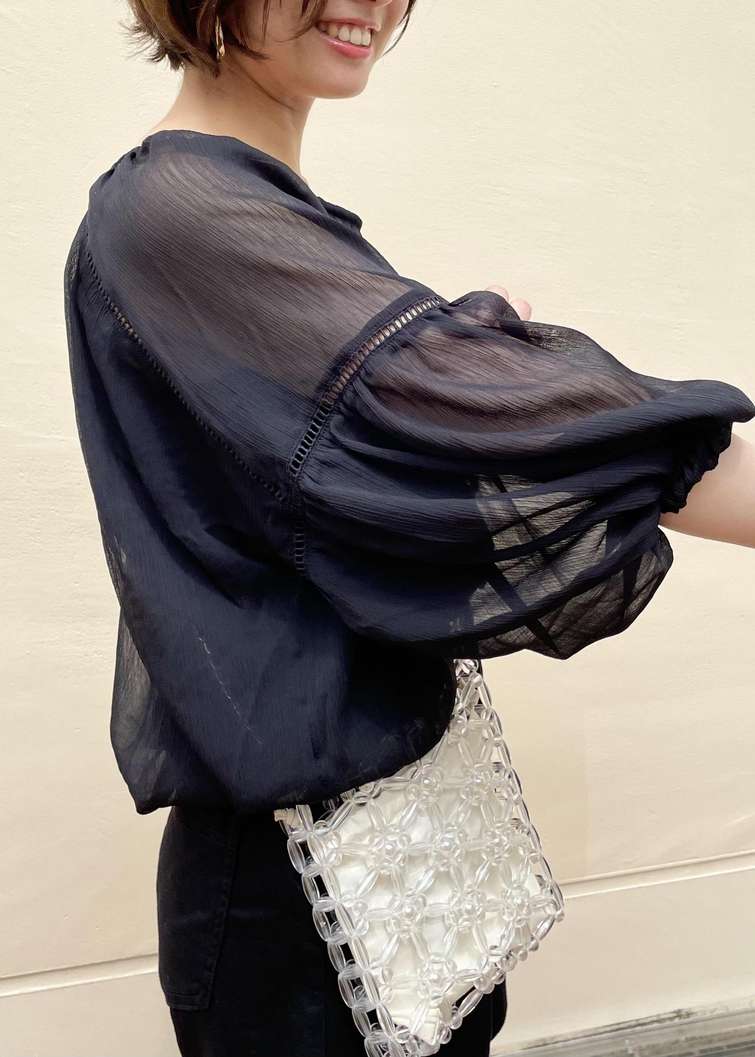 シアー素材とコットン素材の組み合わせで夏らしく、クリアバックでトレンド感もプラスしました。