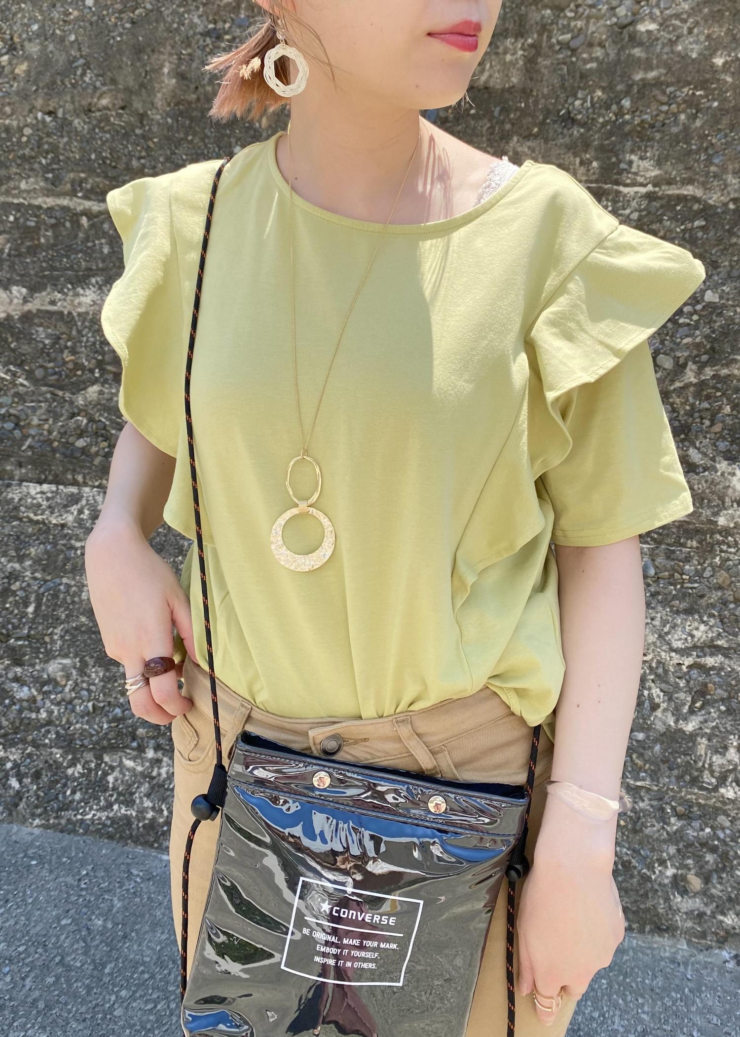 カットソー素材のトップスにデニムパンツを 合わせたカジュアルコーデです