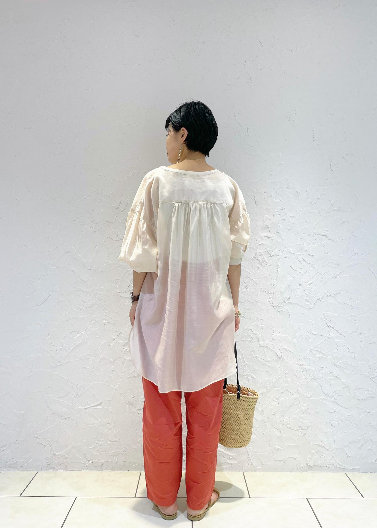 ヴィンテージな雰囲気のカラーパンツに 柔らかな質感のシアーシャツを合わせて モードなスタイリングにしました!