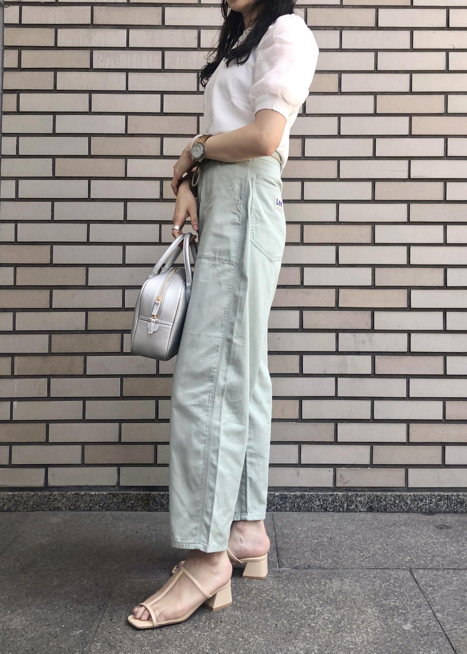カジュアルなイメージのペインターパンツをミント×ホワイトの爽やかなカラーで綺麗めなコーディネートに。 シアー素材やシルバーバッグでより涼しげな印象になりますよ♪ パフスリーブやヒールで女らしさをプラスしたのもポイントです。