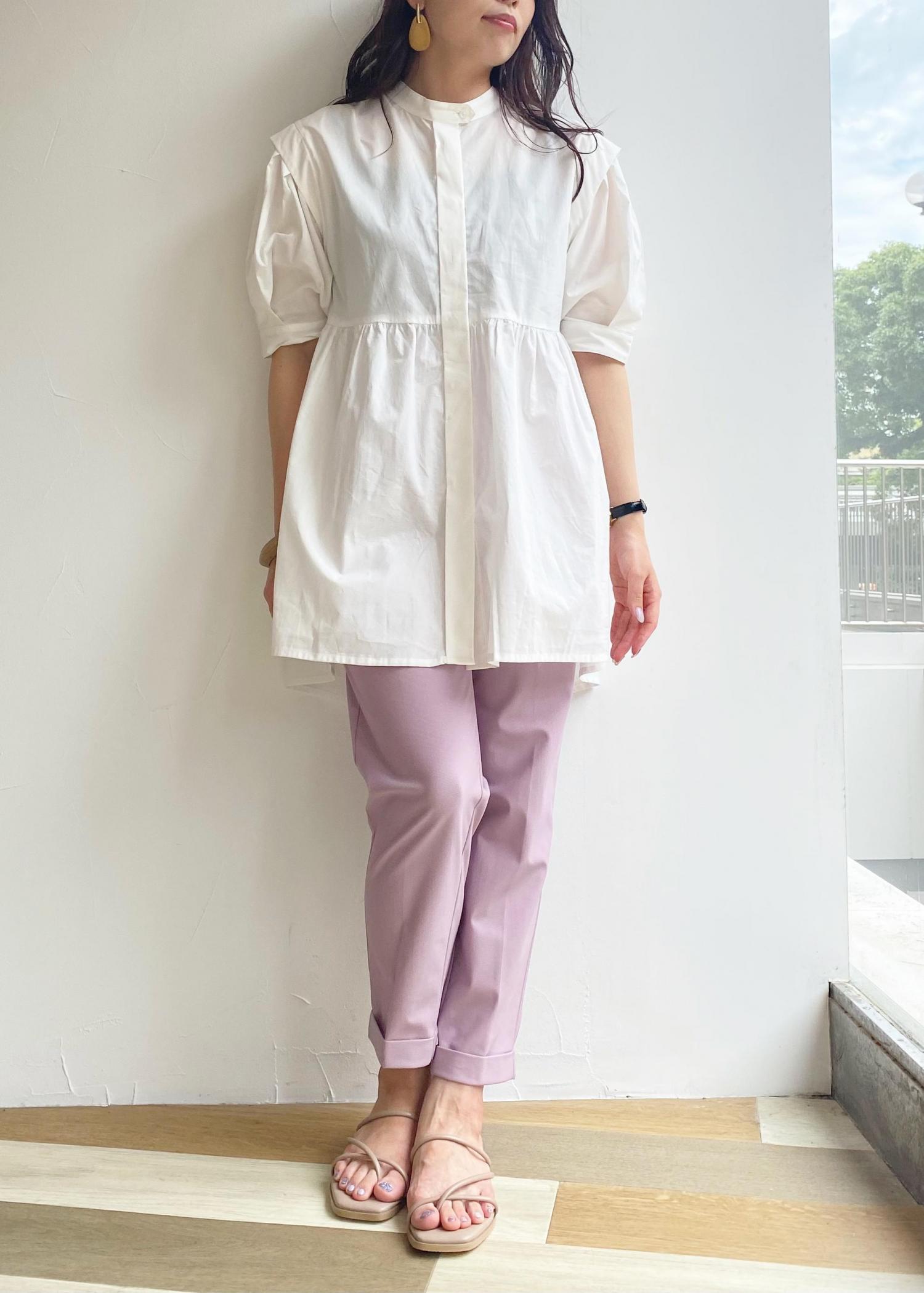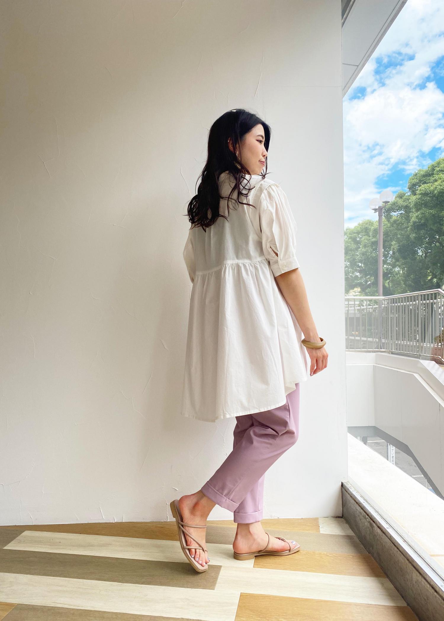 チュニック丈のブラウスは 肩周りのボリューム感がとっても可愛くて今年らしい形です♡ 生地も薄手なのでボリュームが出過ぎない所がお気に入りです◎ ボトムは伸縮性があり本当に履き心地が良いです…! 履きやすいのに色味も綺麗で、使いやすい形なので たくさん着まわせそうです♡ 足元はシンプルにフラットサンダルで合わせました♪ こちらもクッション性があるので 履き心地◎ですよ〜!