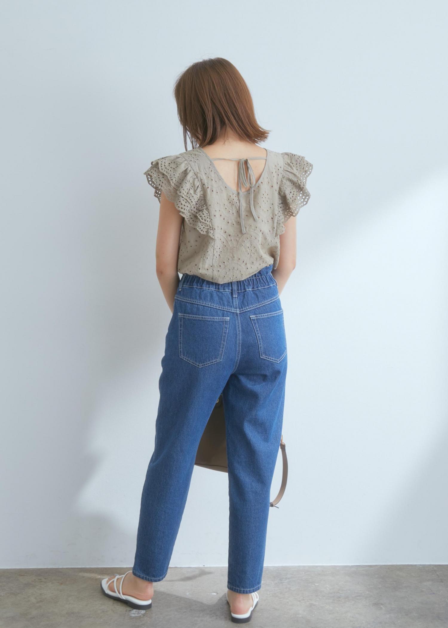 ウェストギャザーデニム&ツイルテーパードパンツ