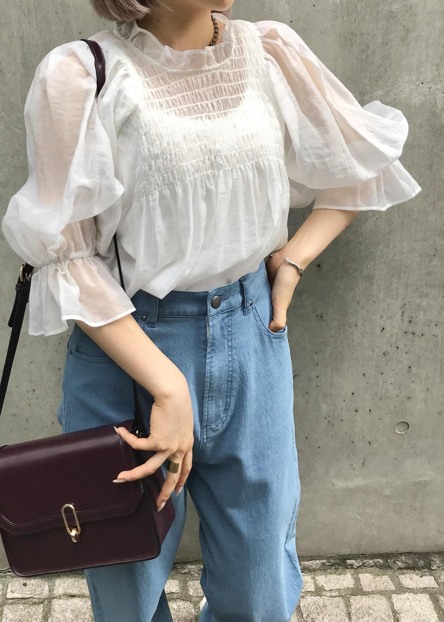 ボリューム袖とシアー感のあるブラウスが女性らしい雰囲気に! シンプルにデニムと合わせて、ブラウスの素材感を引き立たせたコーデです。