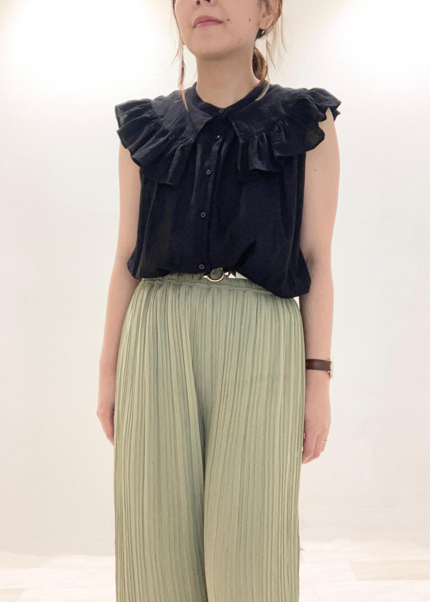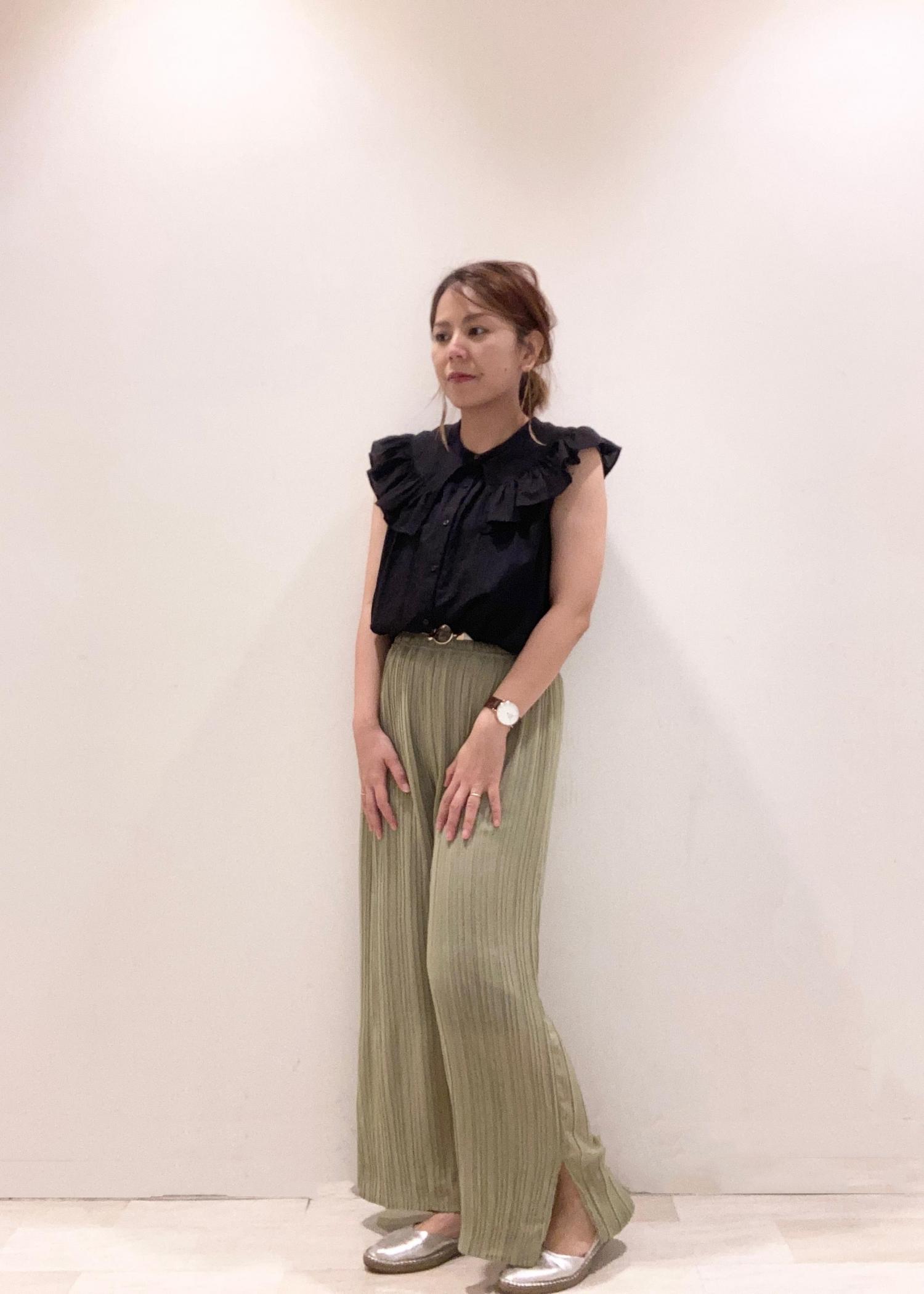 シフォンプリーツパンツを合わせて甘さ控えめにスタイリングしました。