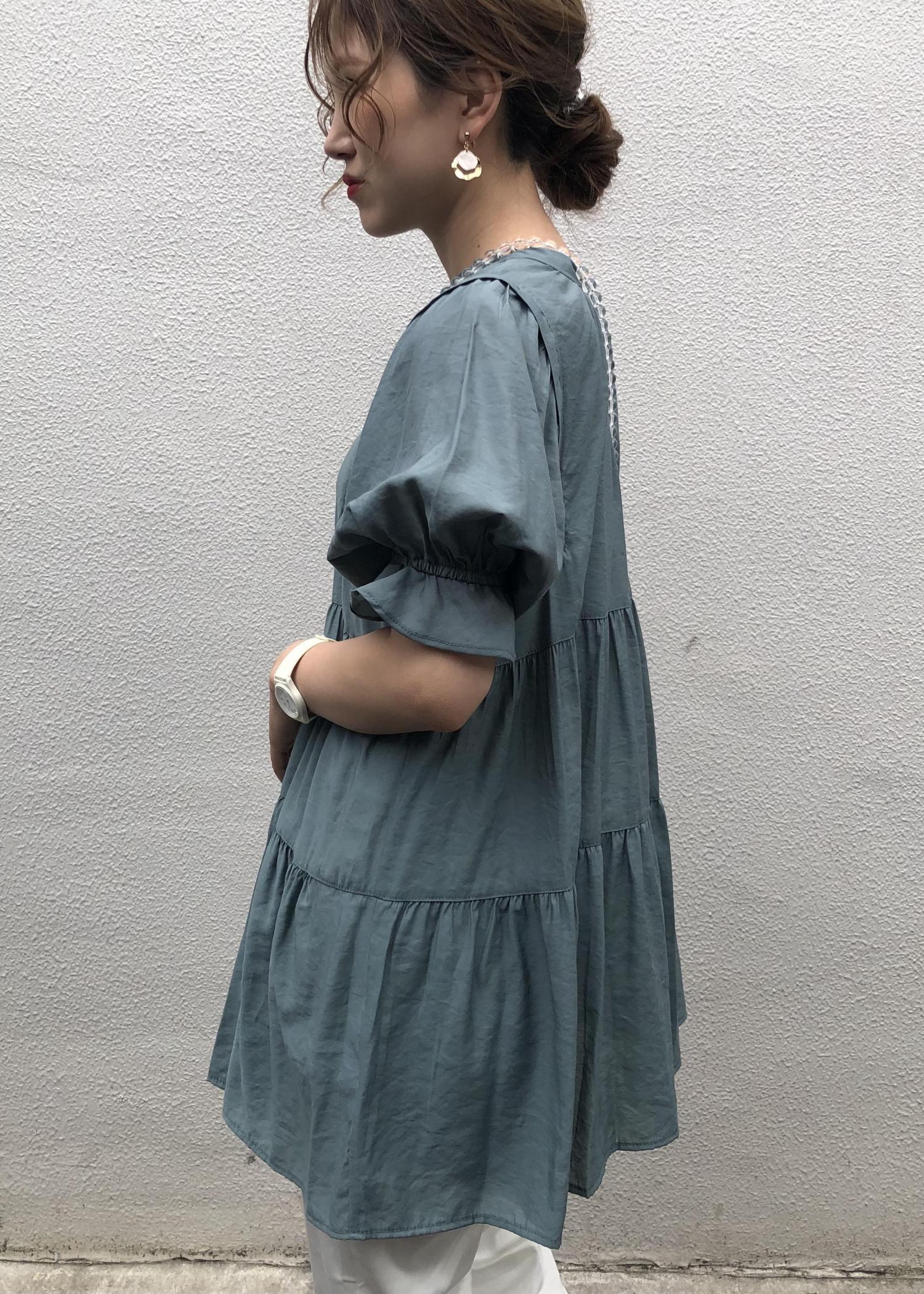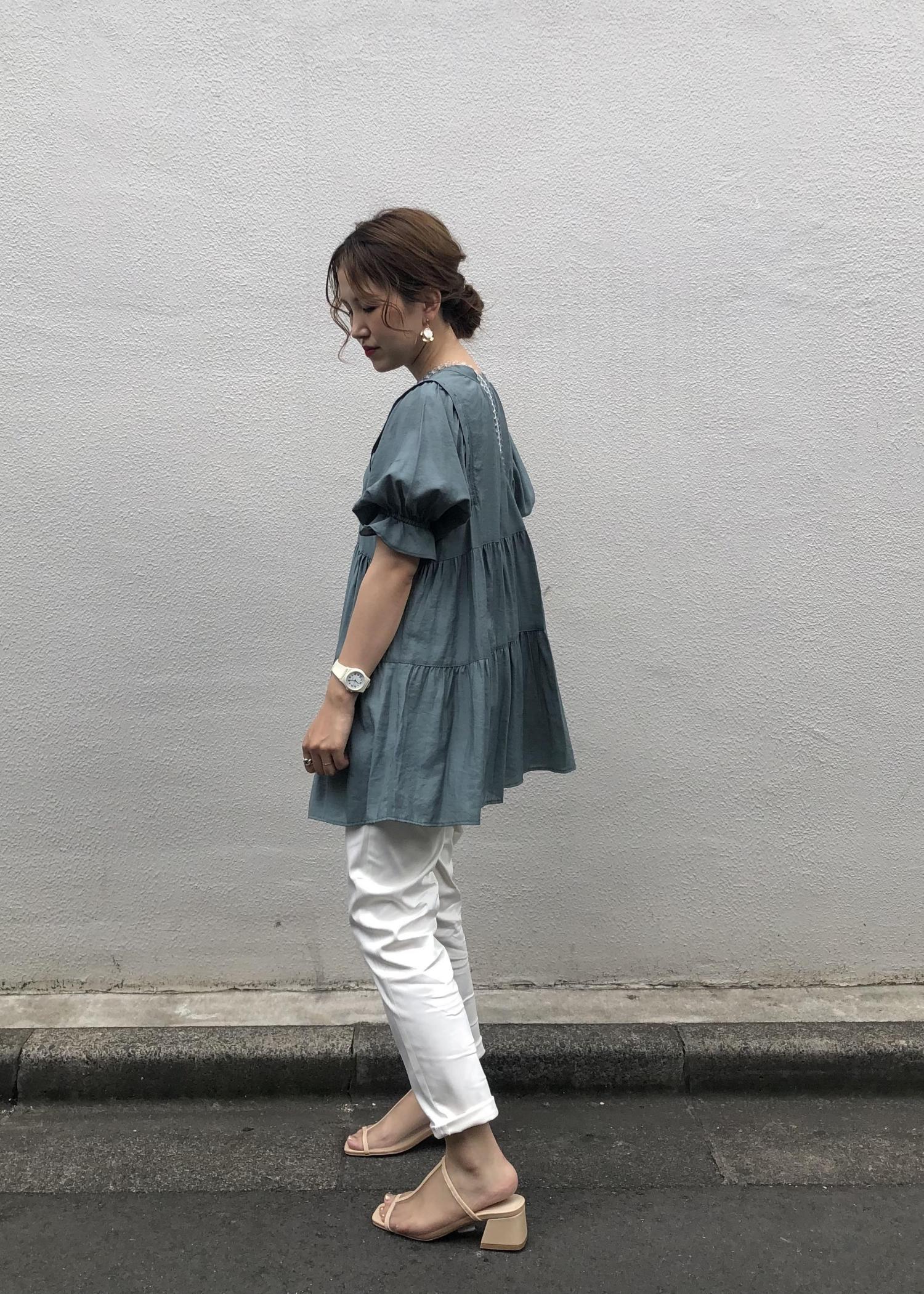 デザインは甘めですが色味が落ち着いたグリーンなので甘すぎず上品なイメージです。 パンツはストレッチが効いていて動きやすく、撥水加工も入っているので雨の日も安心して履けます。