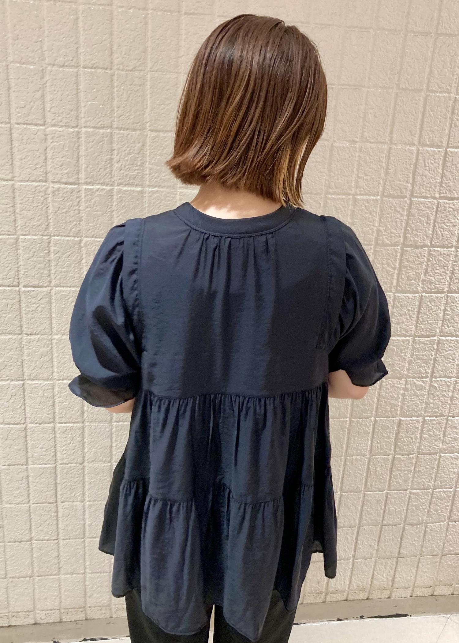 かわいいブラウスなので、あえてオール黒で大人っぽく合わせました♡ 上下ともにサラッと軽い素材のため、黒でも重くならずに着て頂けます。 前後ろを変えたり羽織にしたりといろいろ着回しがきくので、楽しんでコーディネートして頂けると思います☺︎