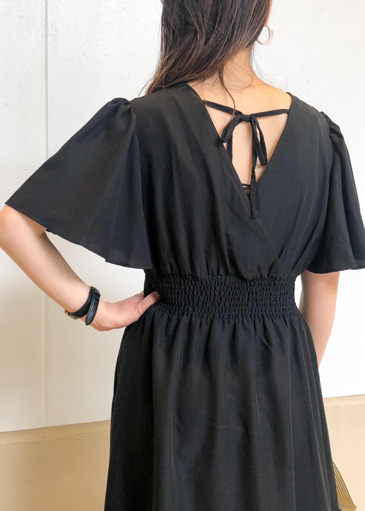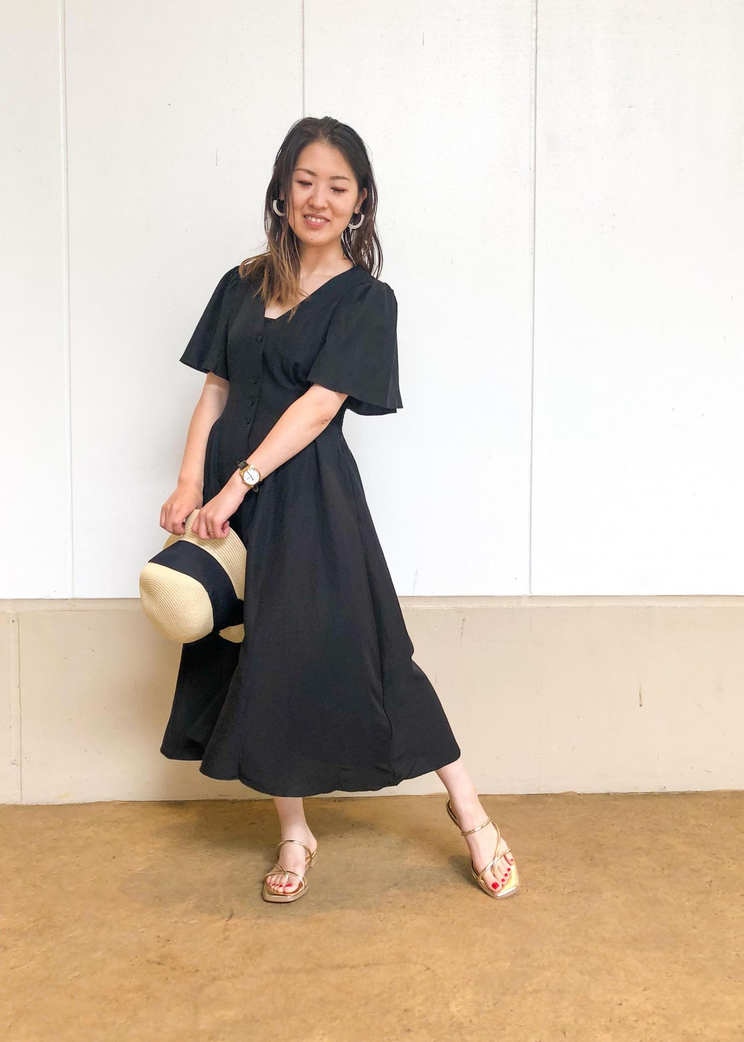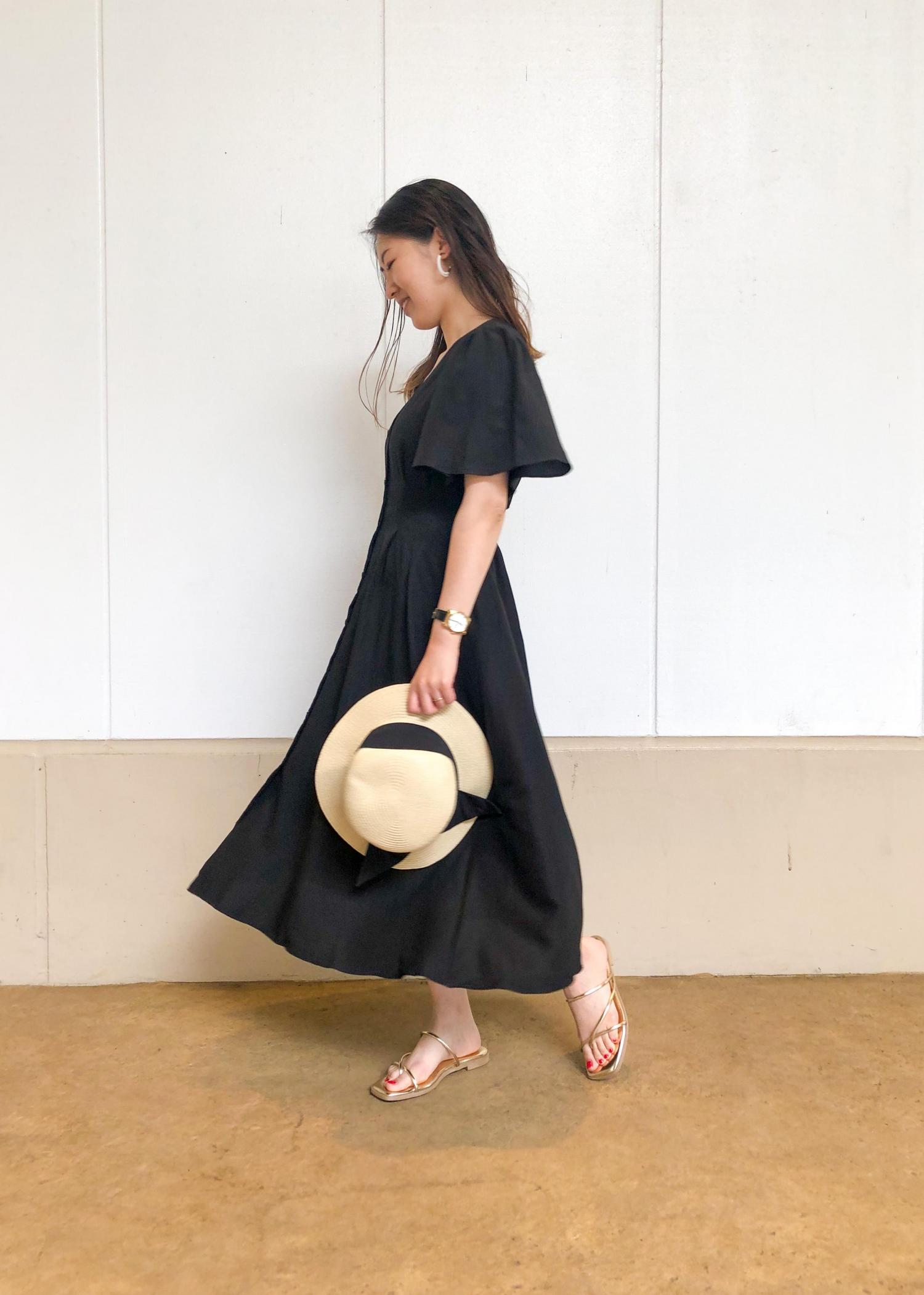 シンプルな黒のワンピースは全体が重くならないように、ゴールドのサンダルと雑材ハットを取り入れて軽さをプラスしました!ワンピースの色とハットのリボンの色はまとめて統一感を意識しました!