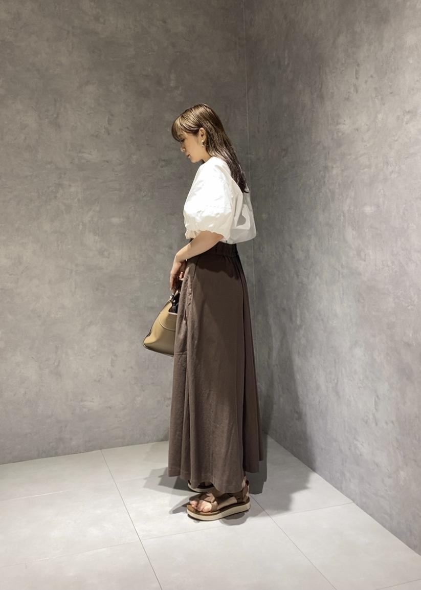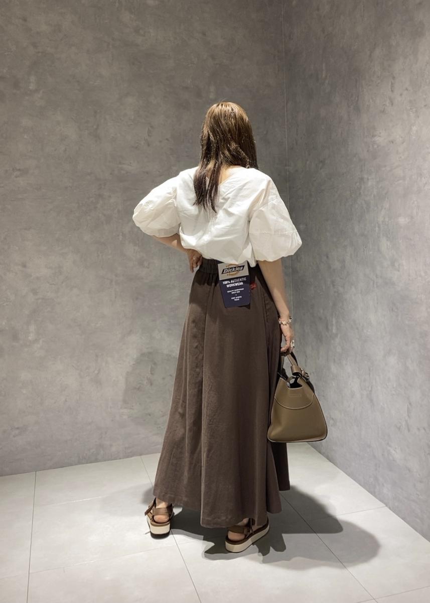 マキシ丈のロングスカートと合わせてインスタイルにしましたが、ワイドパンツなどにアウトスタイルで合わせてあげてもお洒落に決まります♪