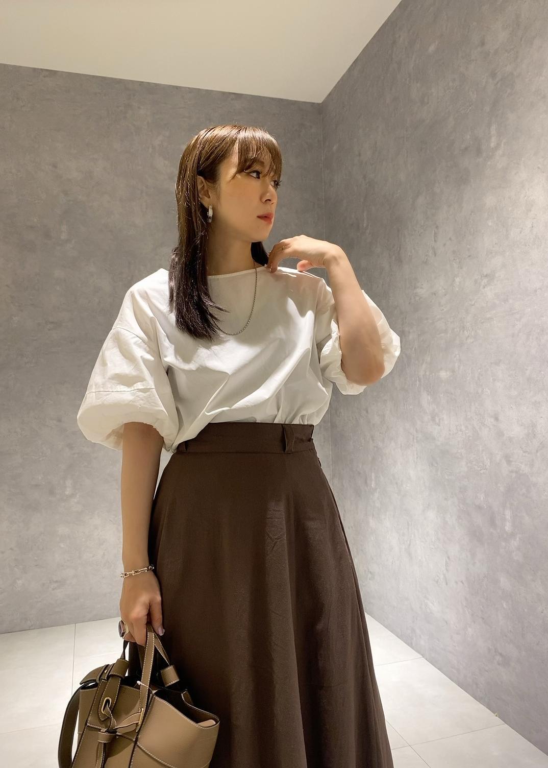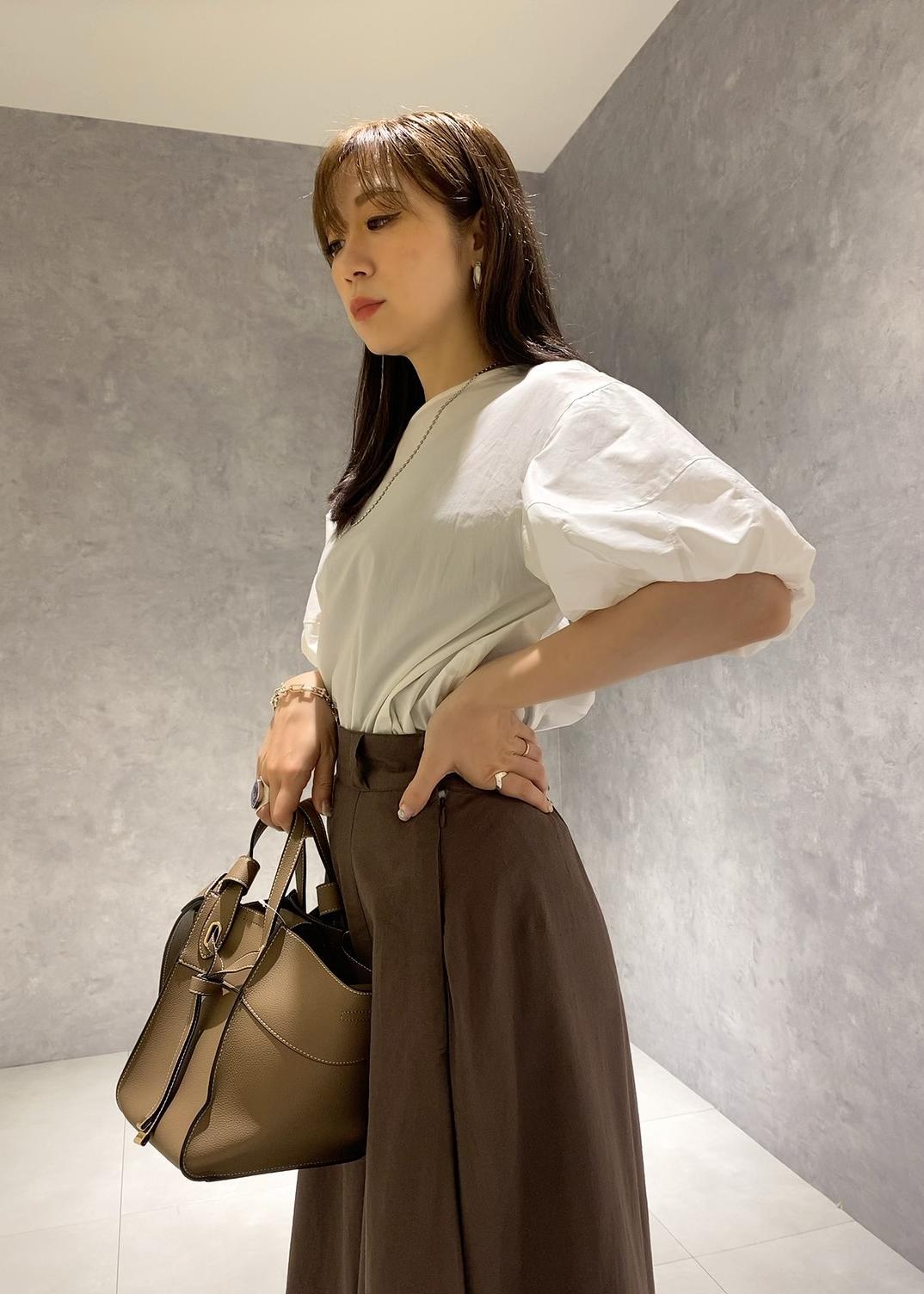 袖のボリュームが可愛らしいブラウスは綿100%の風合いでハリ感があるのでボディーラインも出過ぎずカバーしてくれる効果もあります◎