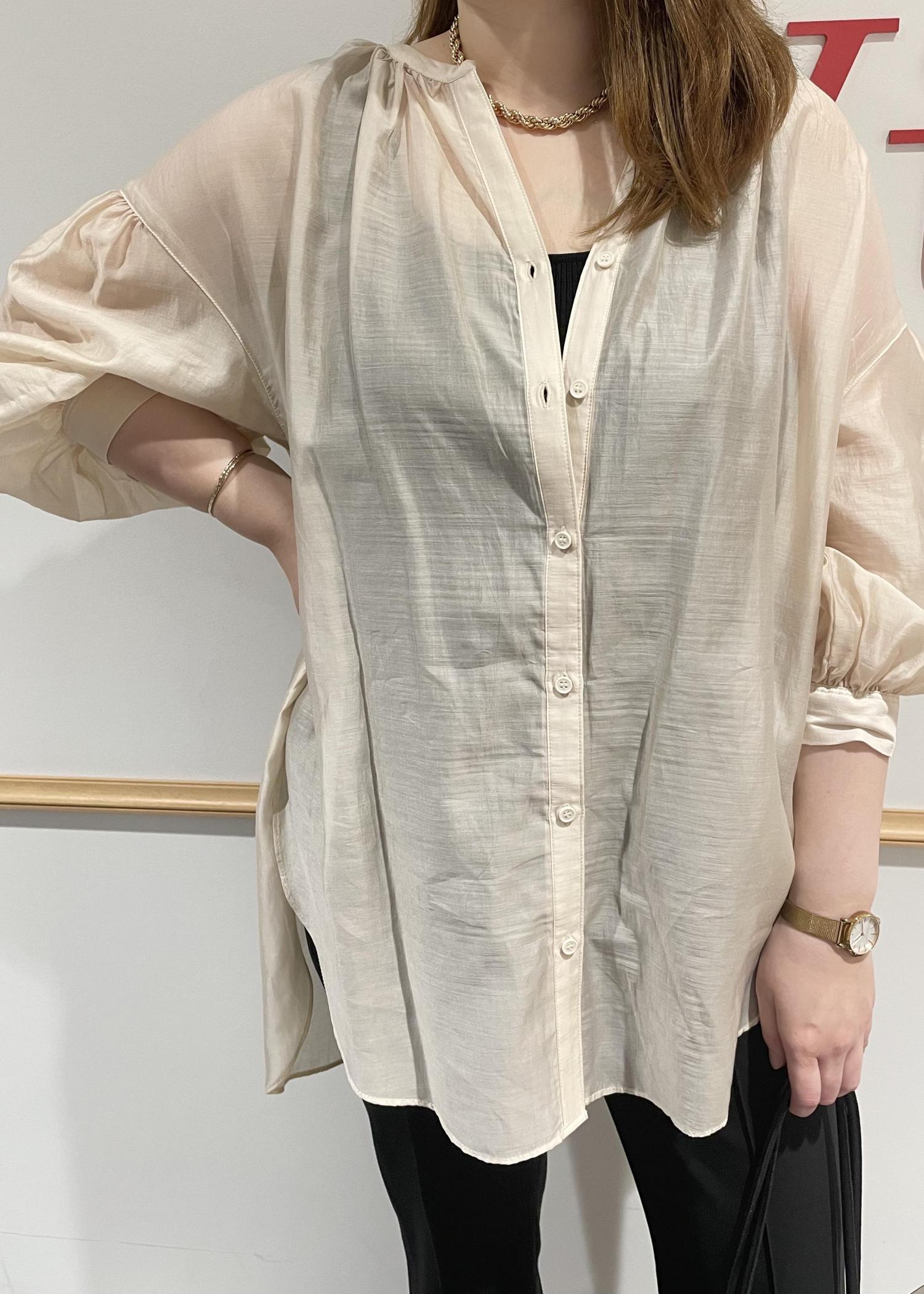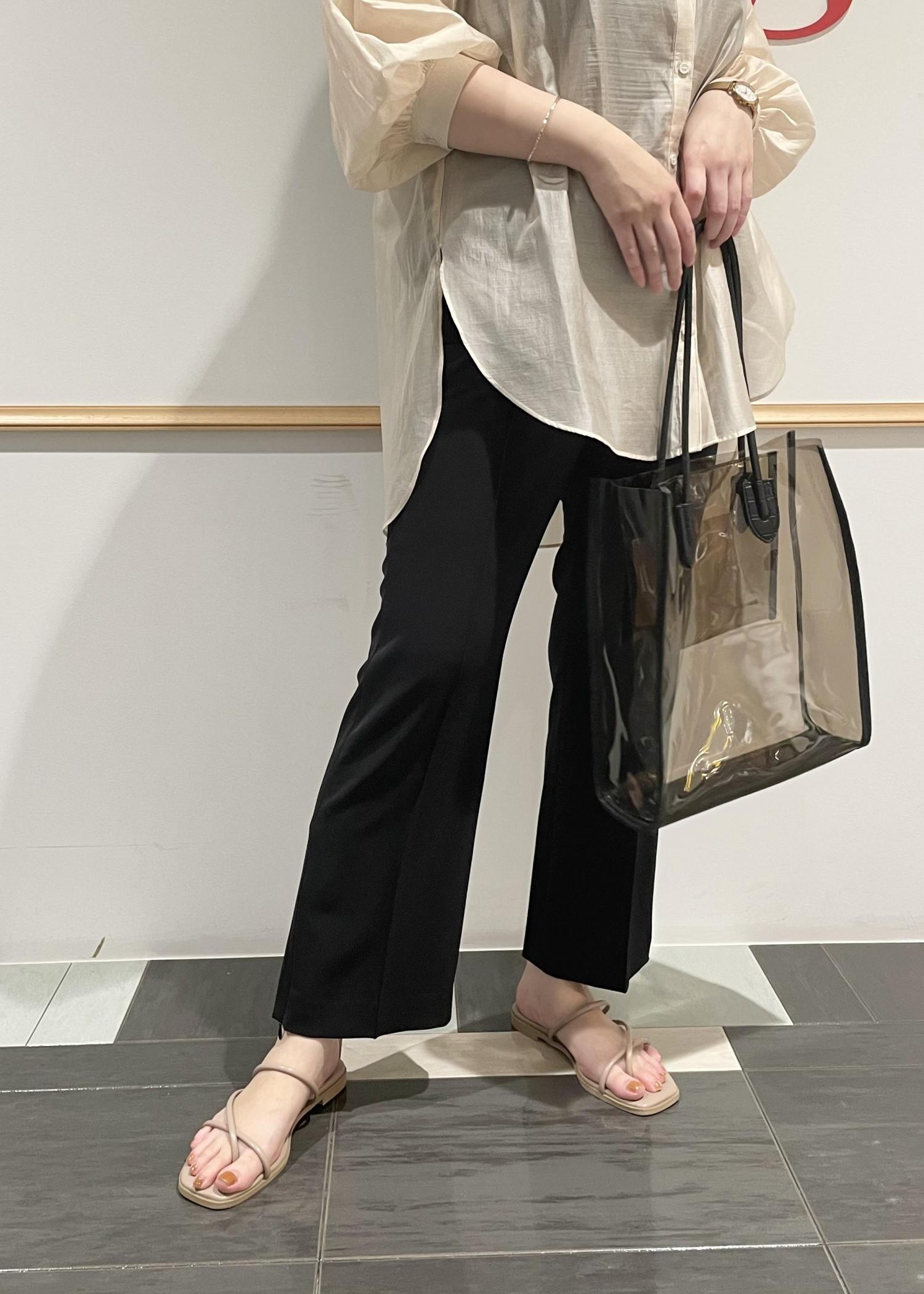 光沢感が綺麗なシアーシャツとブラックパンツでかっこよく☆ シンプルになりすぎないように、大ぶりのチェーンネックレスで華やかさをだしました。