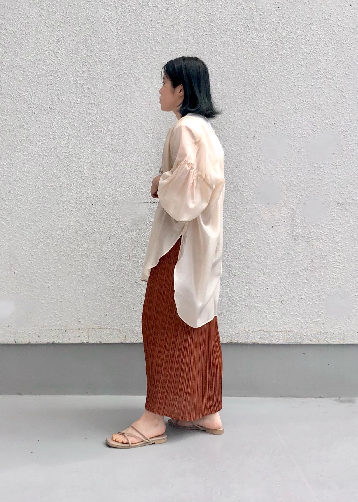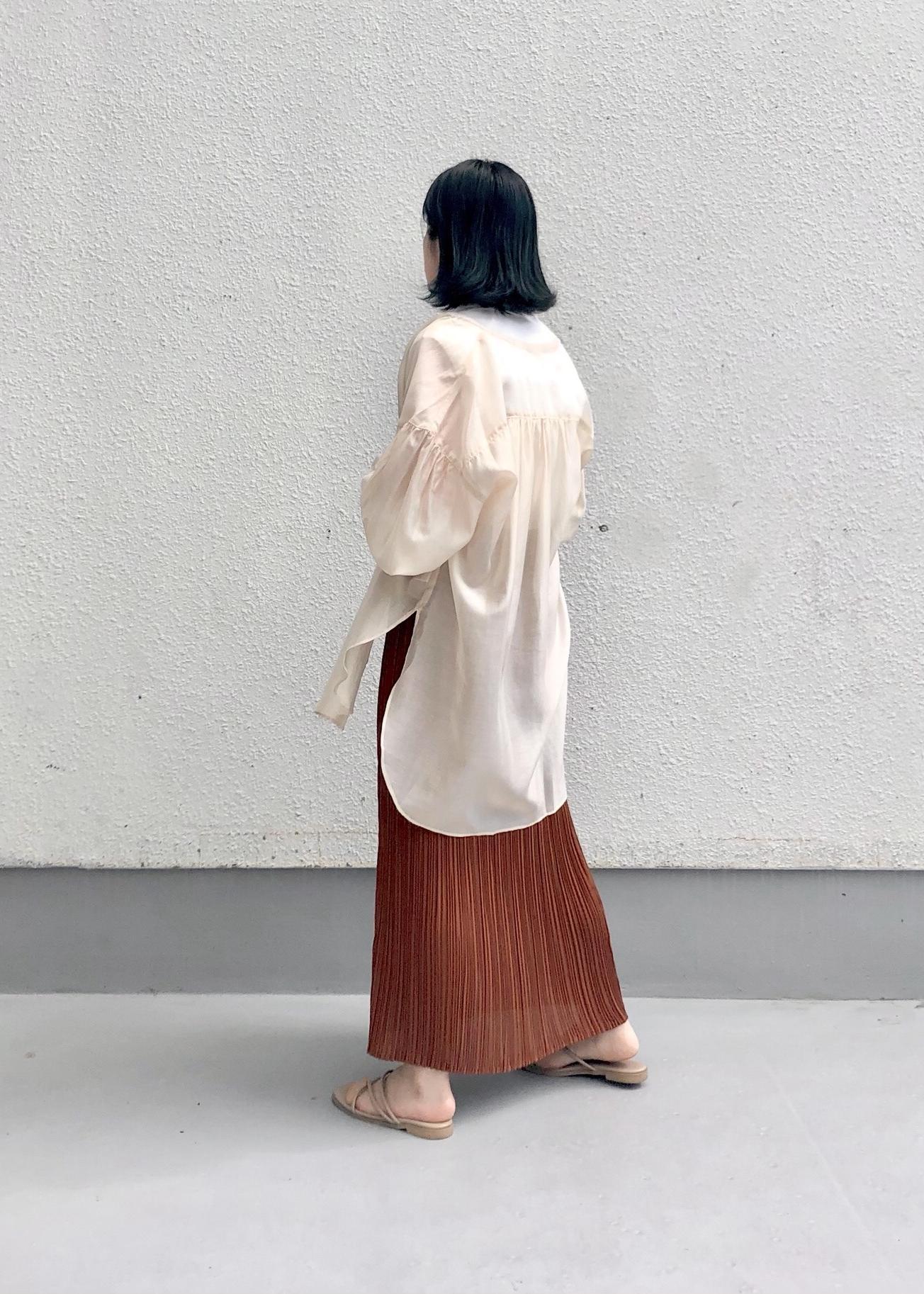 ふんわりした袖とシアー感が涼しげなブラウスは ピンクがかったベージュが女性らしさを 演出してくれます。 スカートはレンガ色で柔らかい雰囲気を崩さない トーンでまとめました。