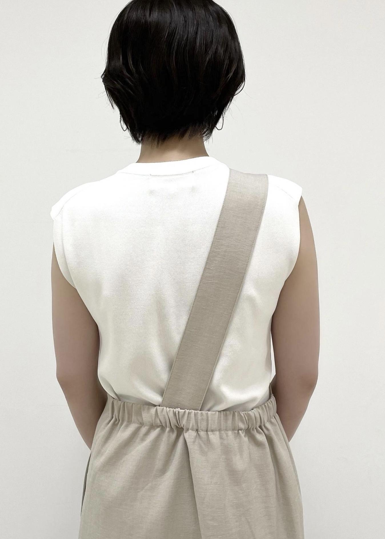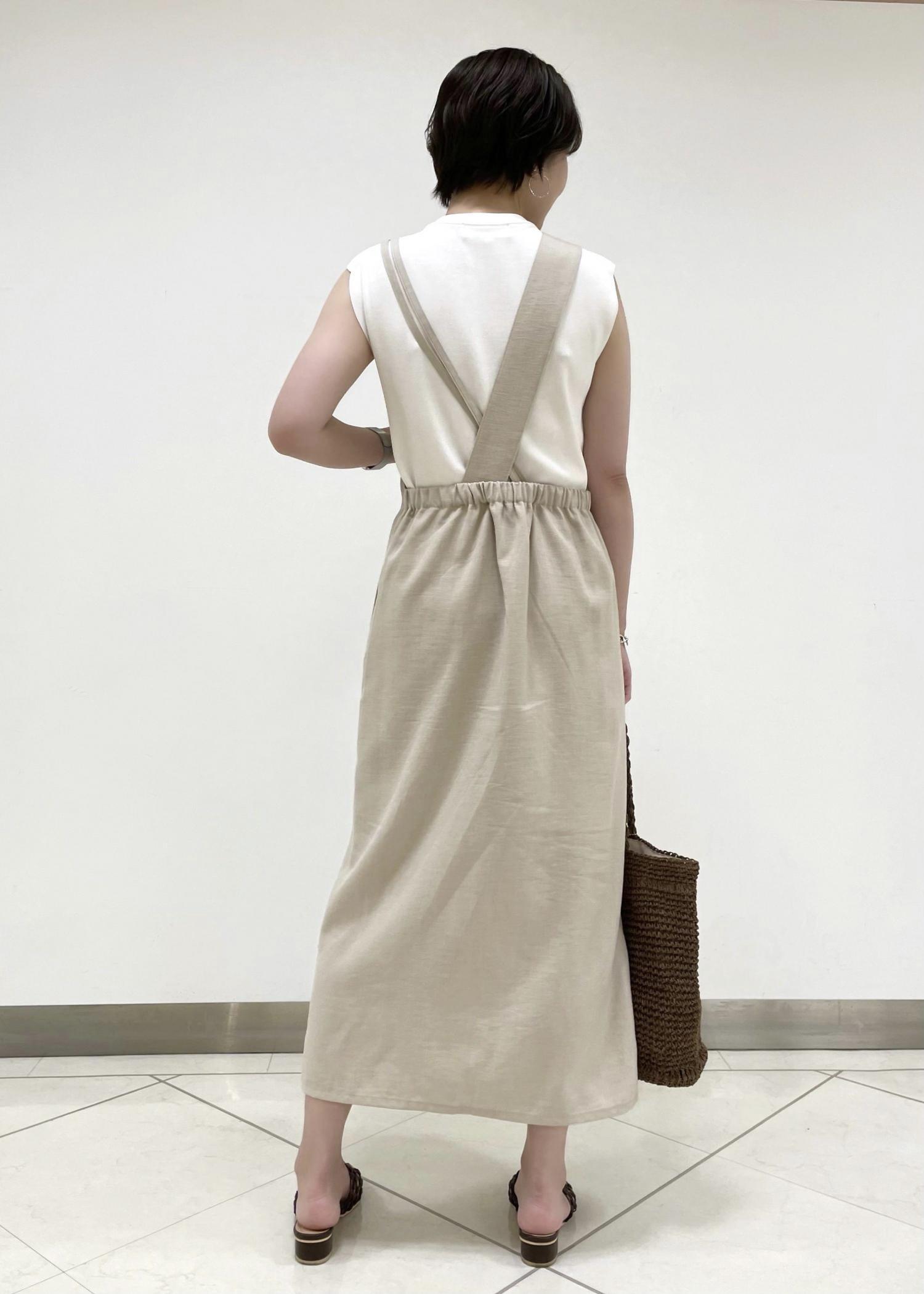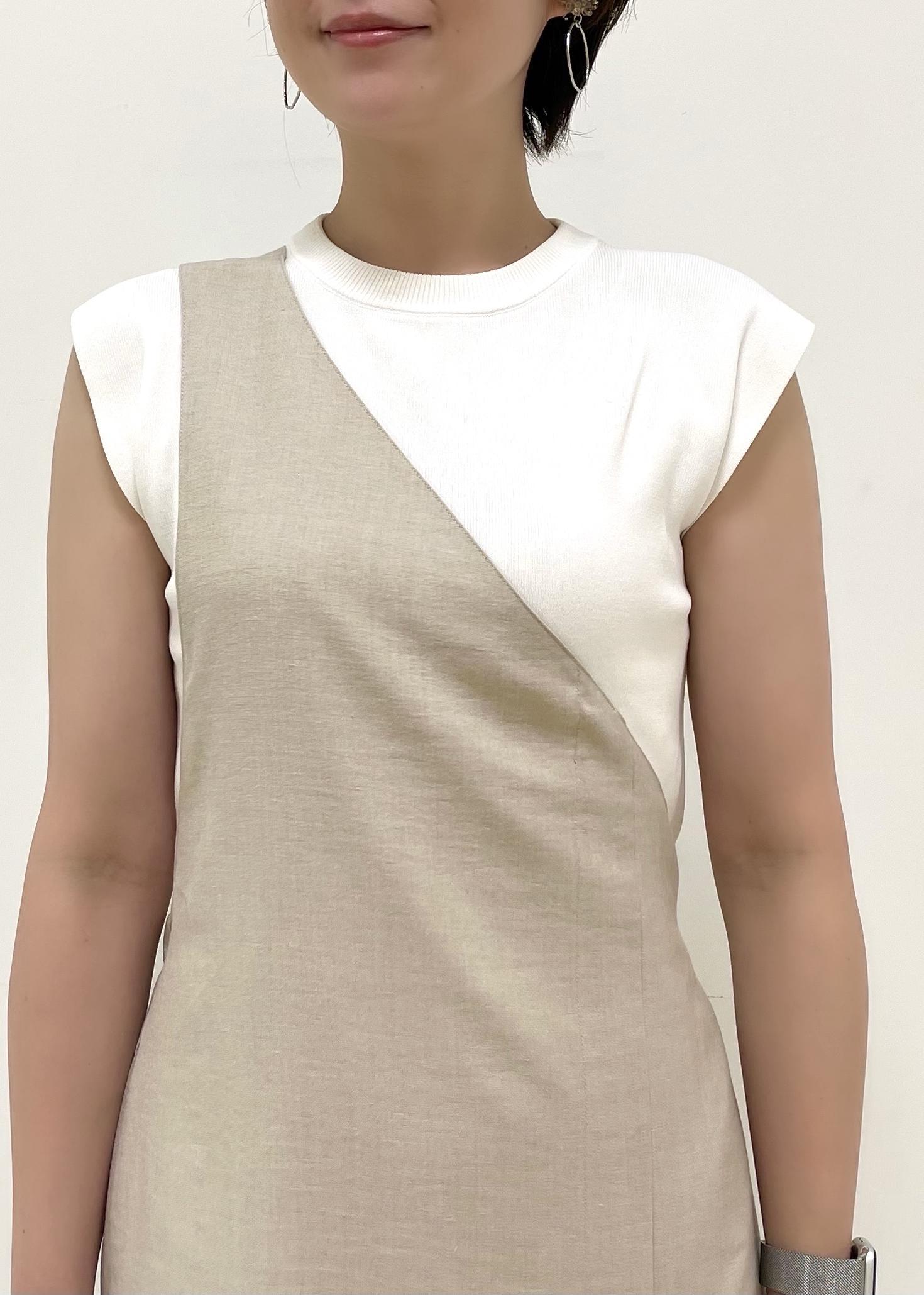 ワンショルダーのトレンドたっぷりなワンピースをシンプルなゼロスリーブニットでコーデ