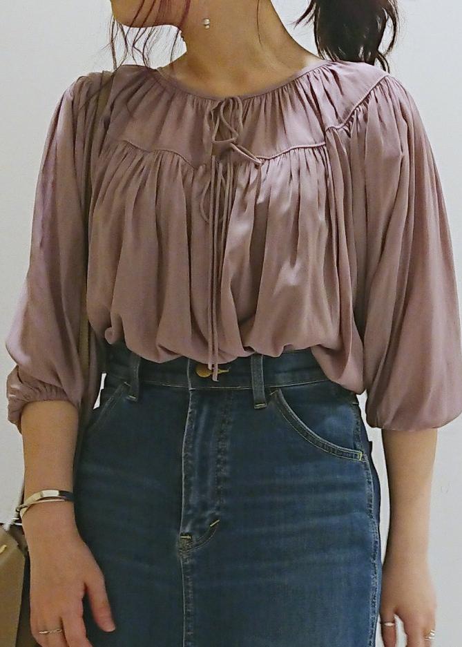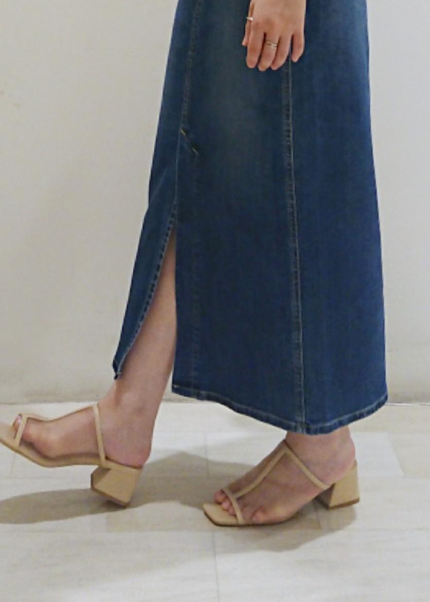 前後2wayのブラウスを使ったコーディネートです。 フロントリボンで可愛らしい印象のブラウスはデニムスカートを合わせてカジュアルに。 秋に向けて落ち着いた色味で合わせたので、チュールサンダルで夏らしさを残したスタイルにしました。