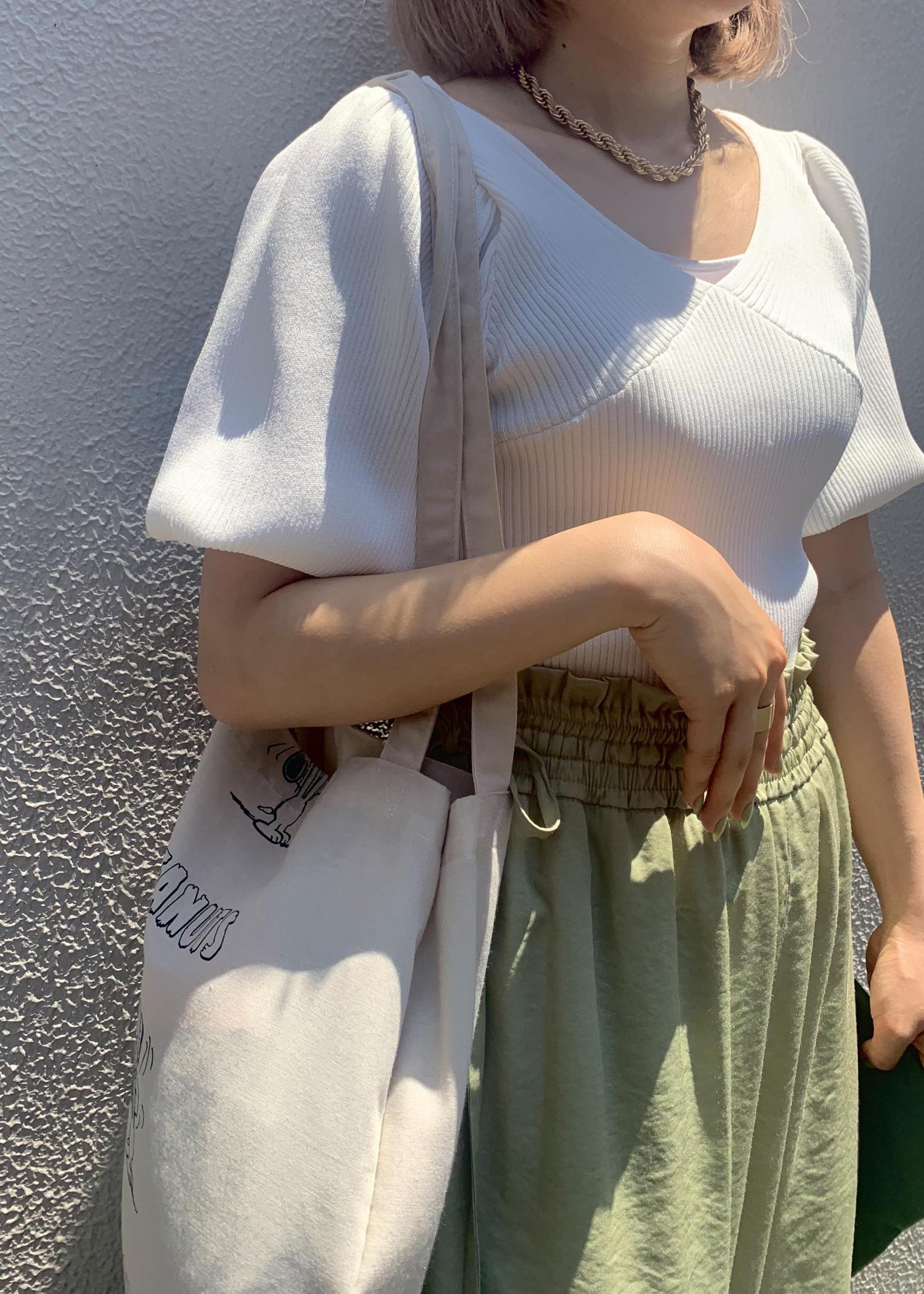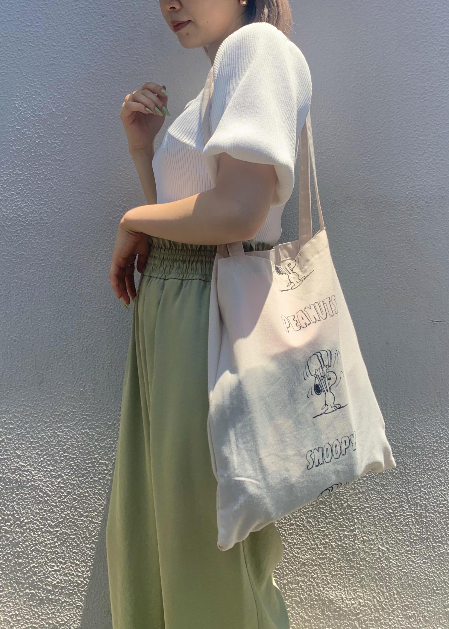 光沢感のあるワイドパンツとシンプルなボリュームスリーブのトップスを合わせたカジュアルコーデ! デコルテが見えるので女性らしさも! PEANUTSとコラボしたトートバッグは、A4サイズでしっかり荷物が入るのでおすすめです。