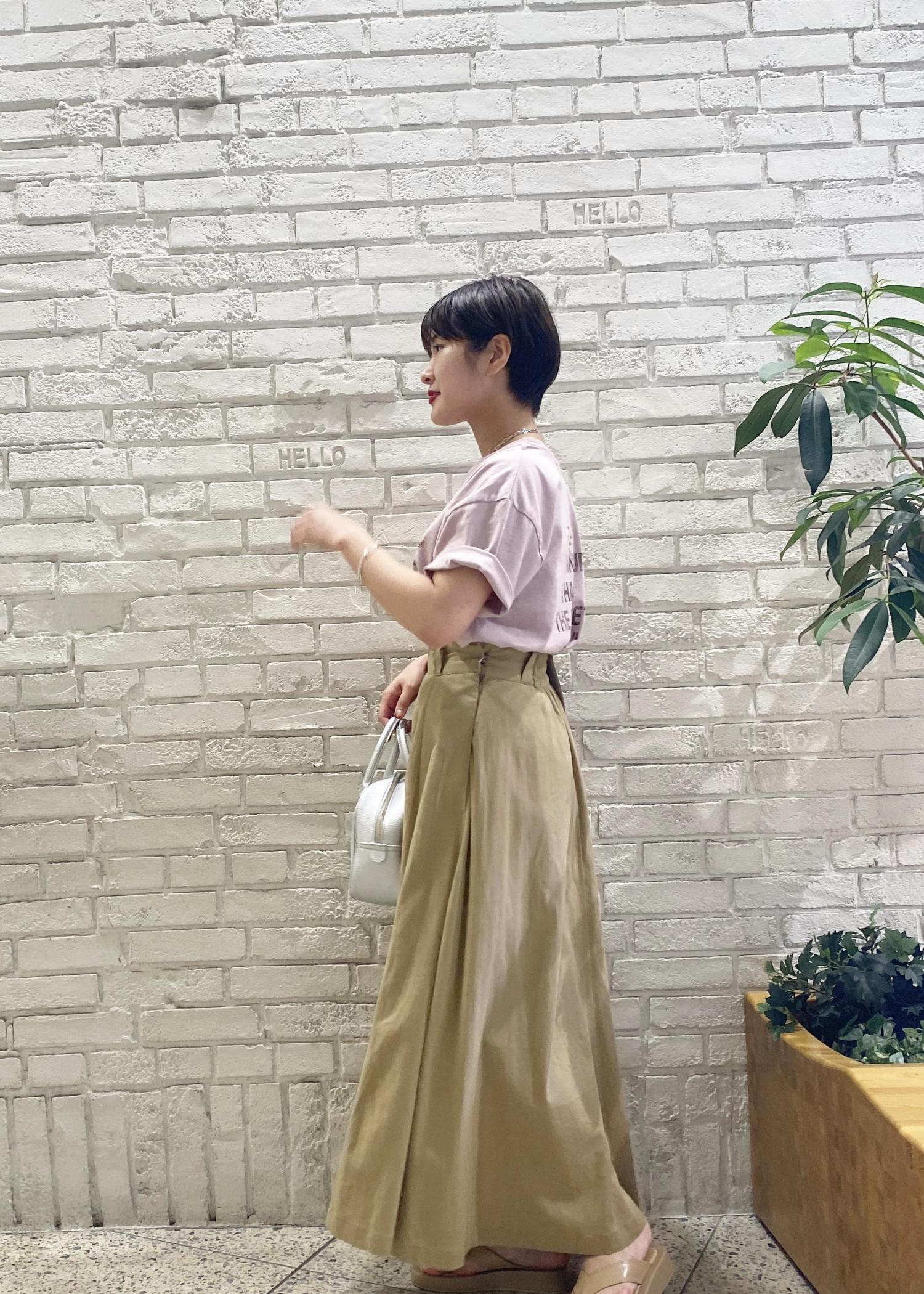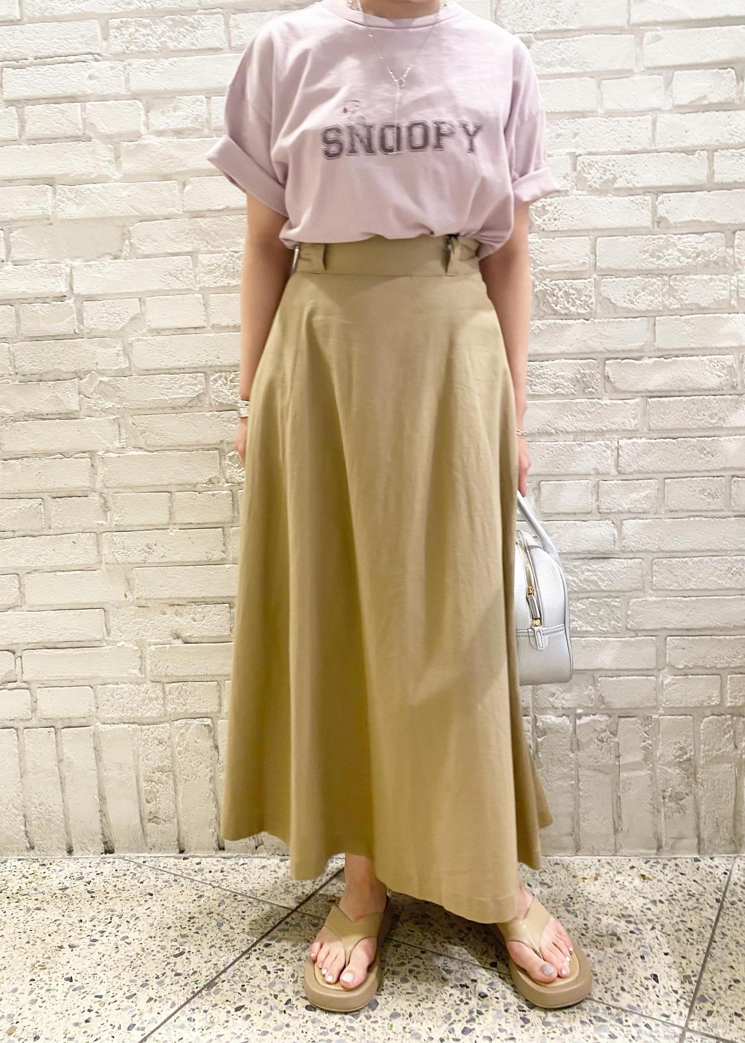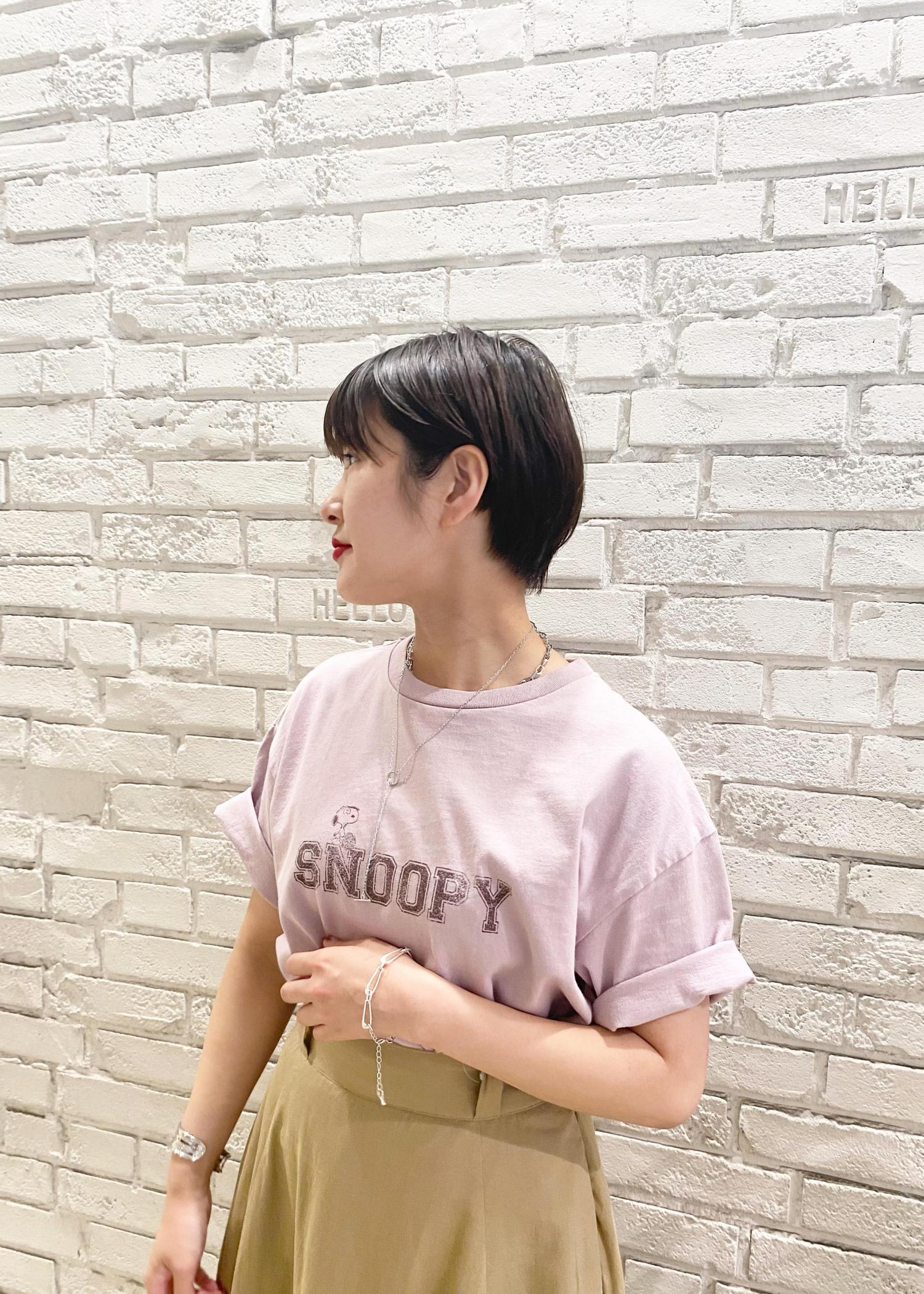 トップス→スヌーピーコラボ ボトム→Dickiesコラボ ピンク×ベージュで女性らしい優しい印象に◎