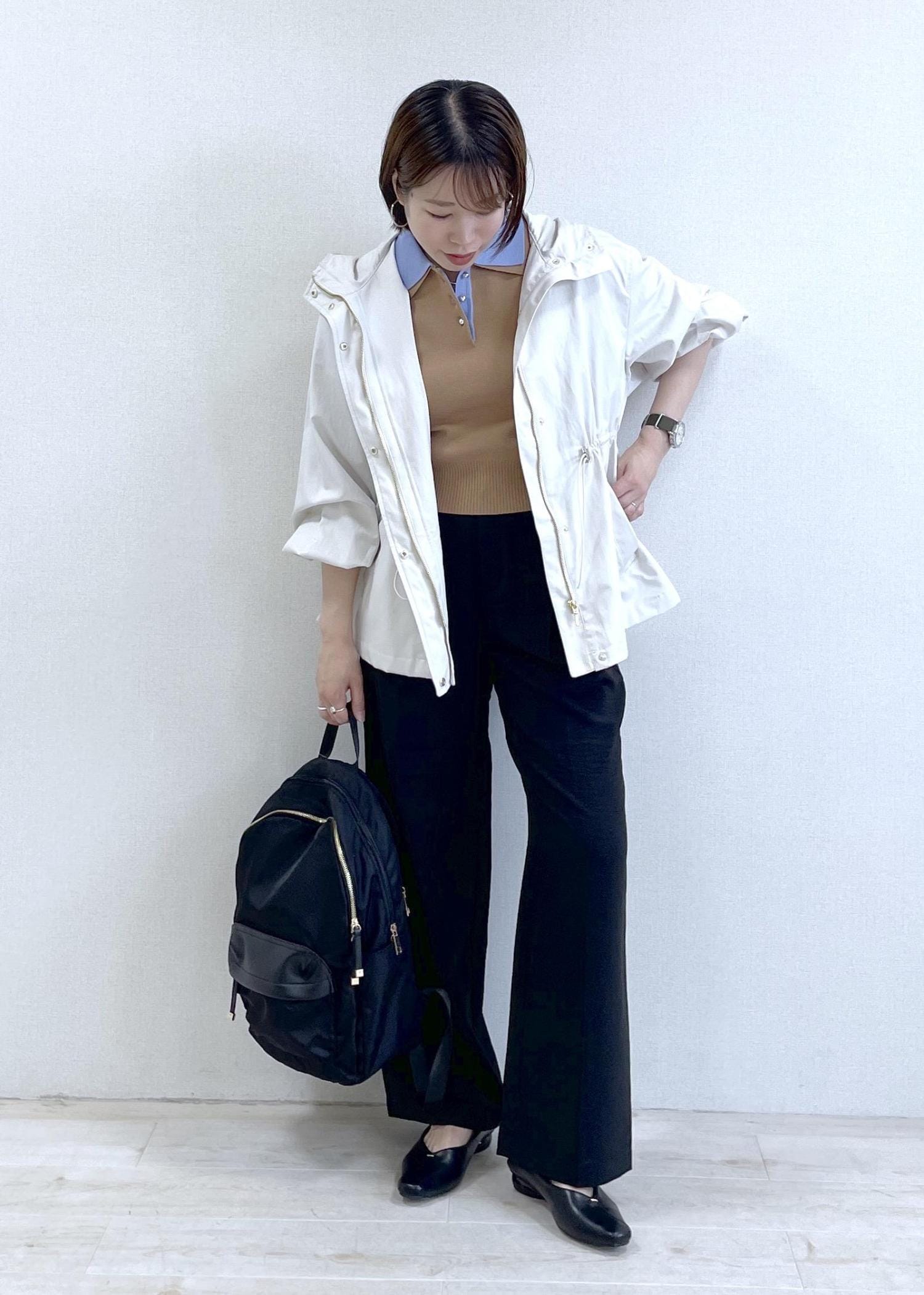 今から秋口まで長く使えるトップス! 程よく体にフィットするので、カジュアルになりすぎません。 細めのサスペンダーパンツと合わせて、メンズライクなコーディネートです。