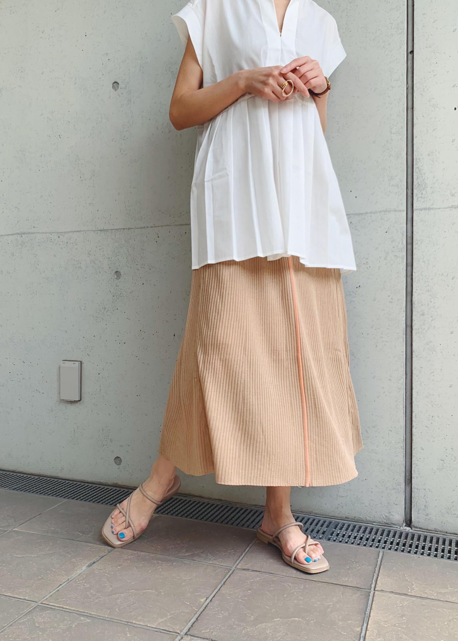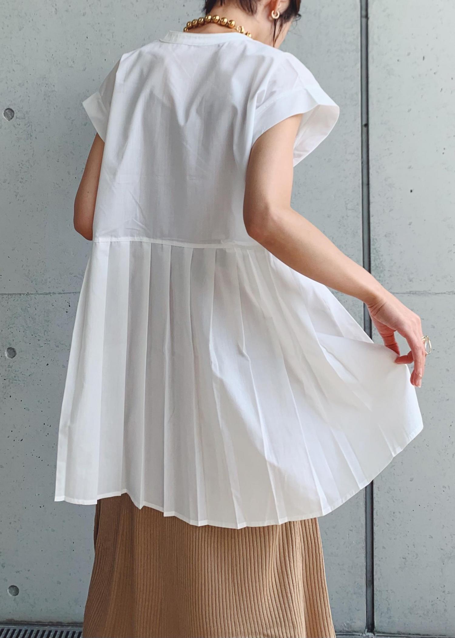 プリーツが映えるタイプライターシャツ✩.*˚ ハリ感のある素材がシルエットを美しく見せてくれます! チュニック丈でパンツとの相性抜群ですが、 ワンピースで変化を付けたスタイリングもオススメです♡