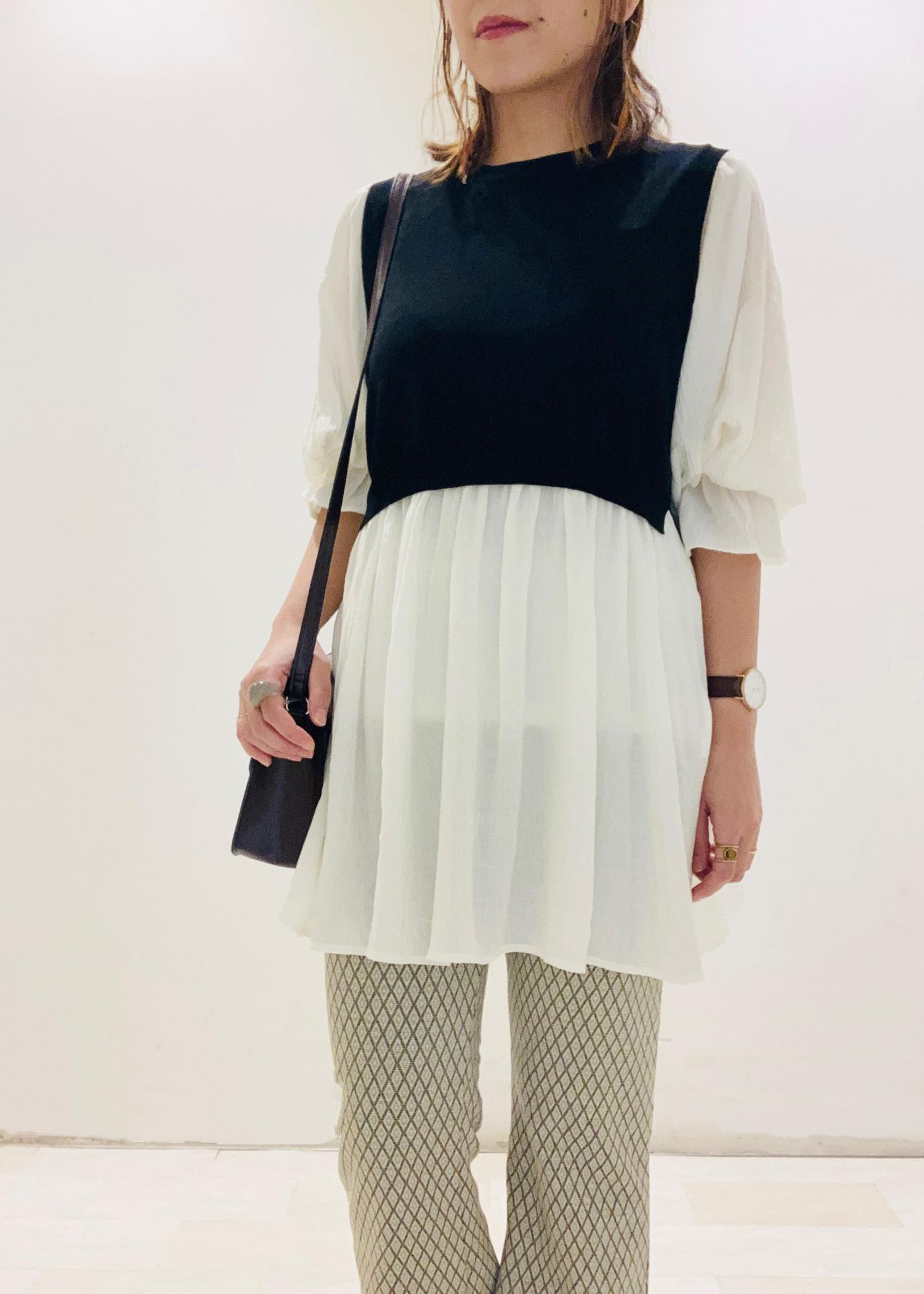 ニットベストと布帛の素材がドッキングされたチュニックプルオーバーは一枚で決まり、楽に美しく時短ができる優秀アイテムです◎
