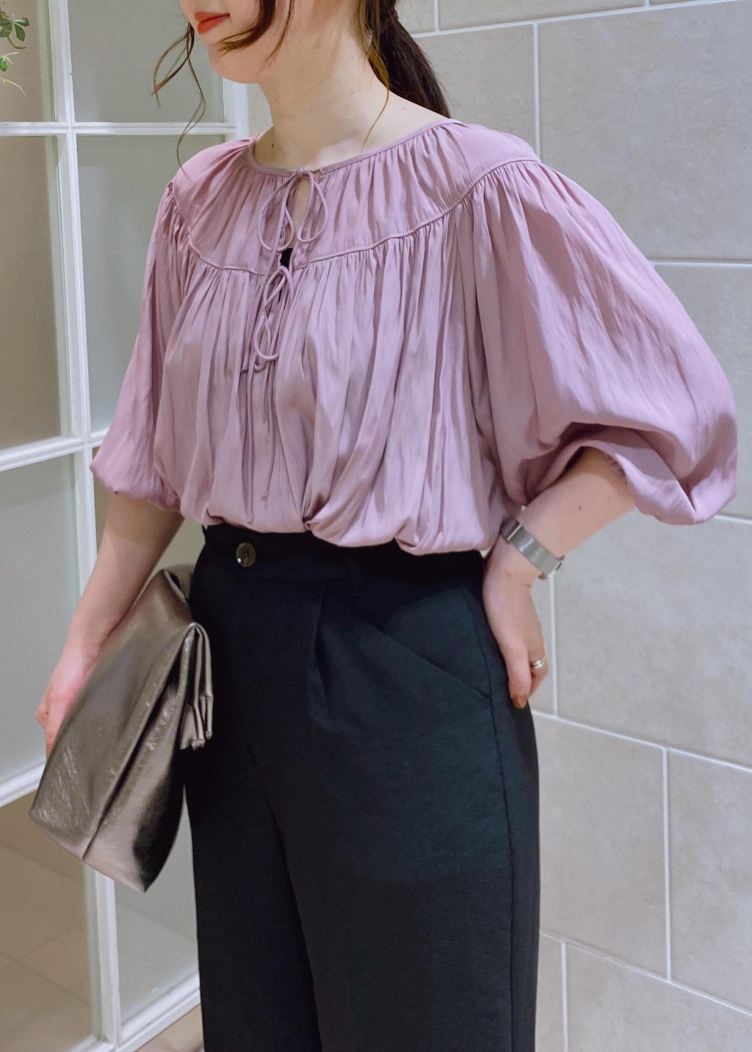 ラベンダーカラーを主役にしたコーディネートです。 ギャザーをたっぷりとあしらった主役級のブラウスにブラックのワイドパンツを合わせて、オフィスでも映えるスタイリングです。 ラベンダーカラーはトレンドのくすみカラーなので、派手過ぎず、カラーアイテムに抵抗があってもチャレンジしやすいカラーです。