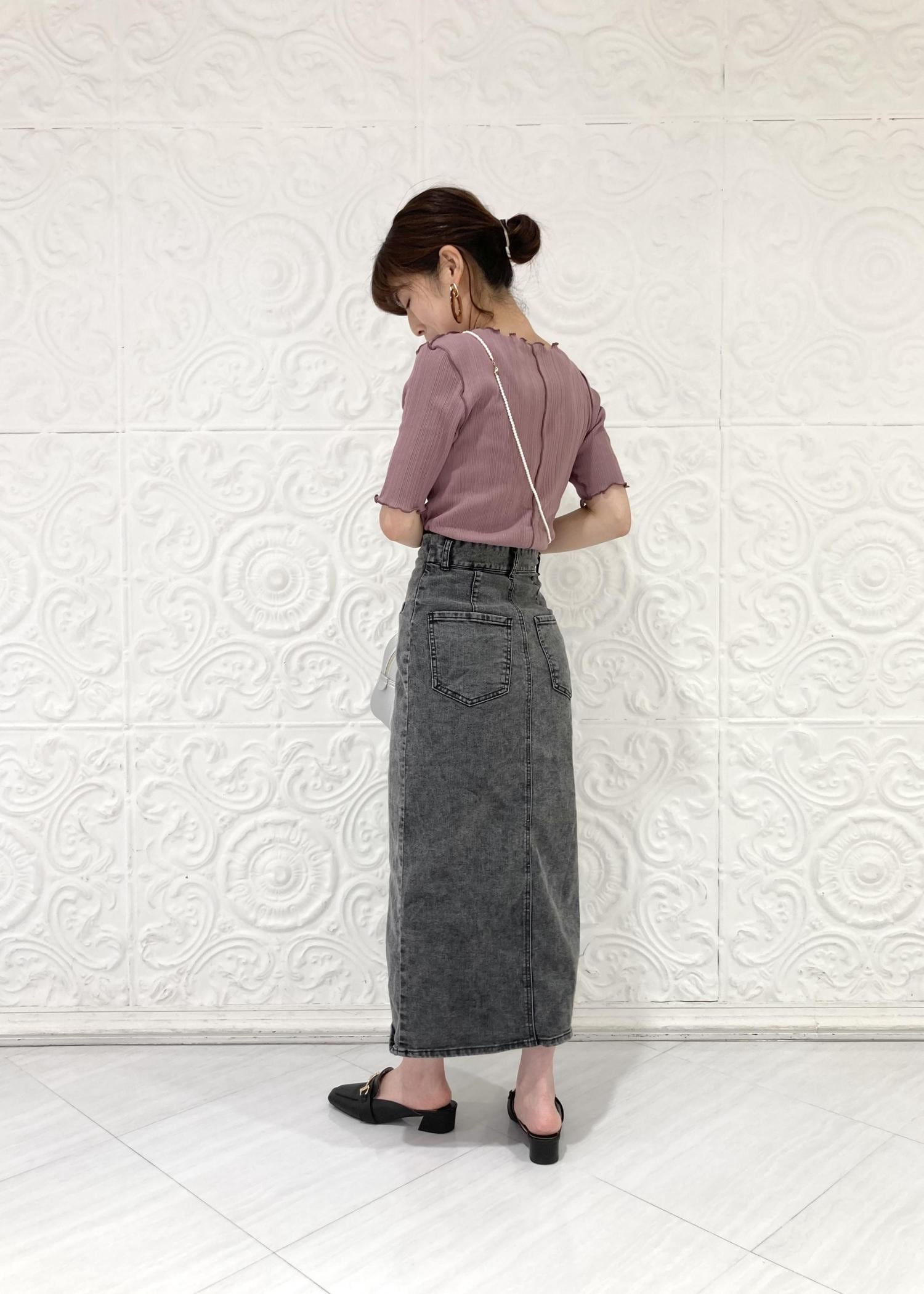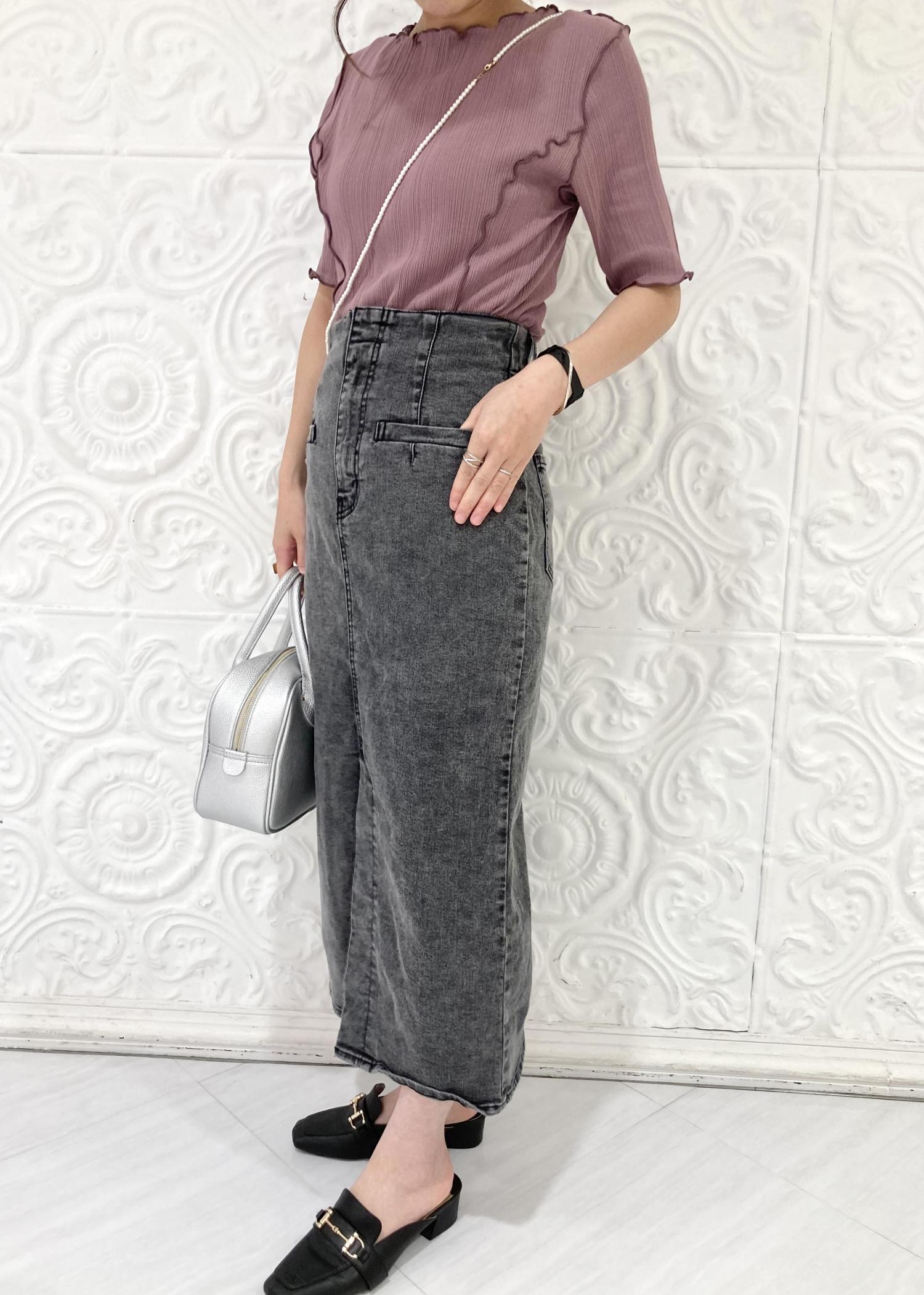 くすみパープルとスッキリ着られるIラインのスカートで大人カジュアルなイメージ⭐︎