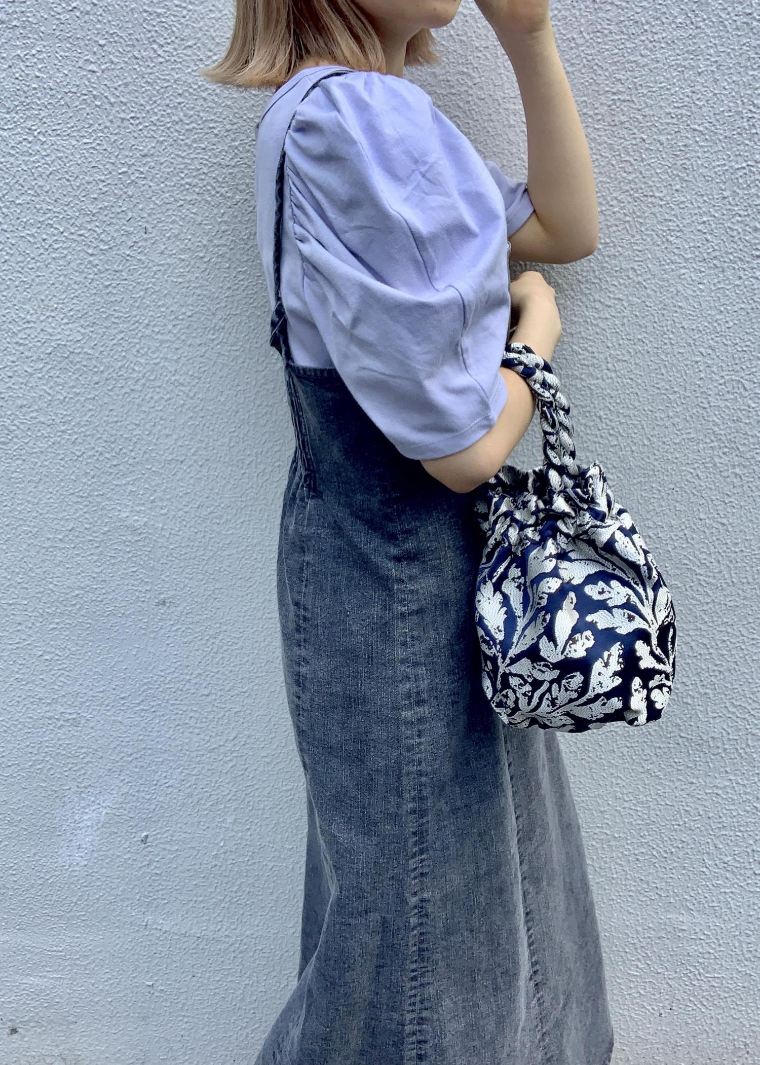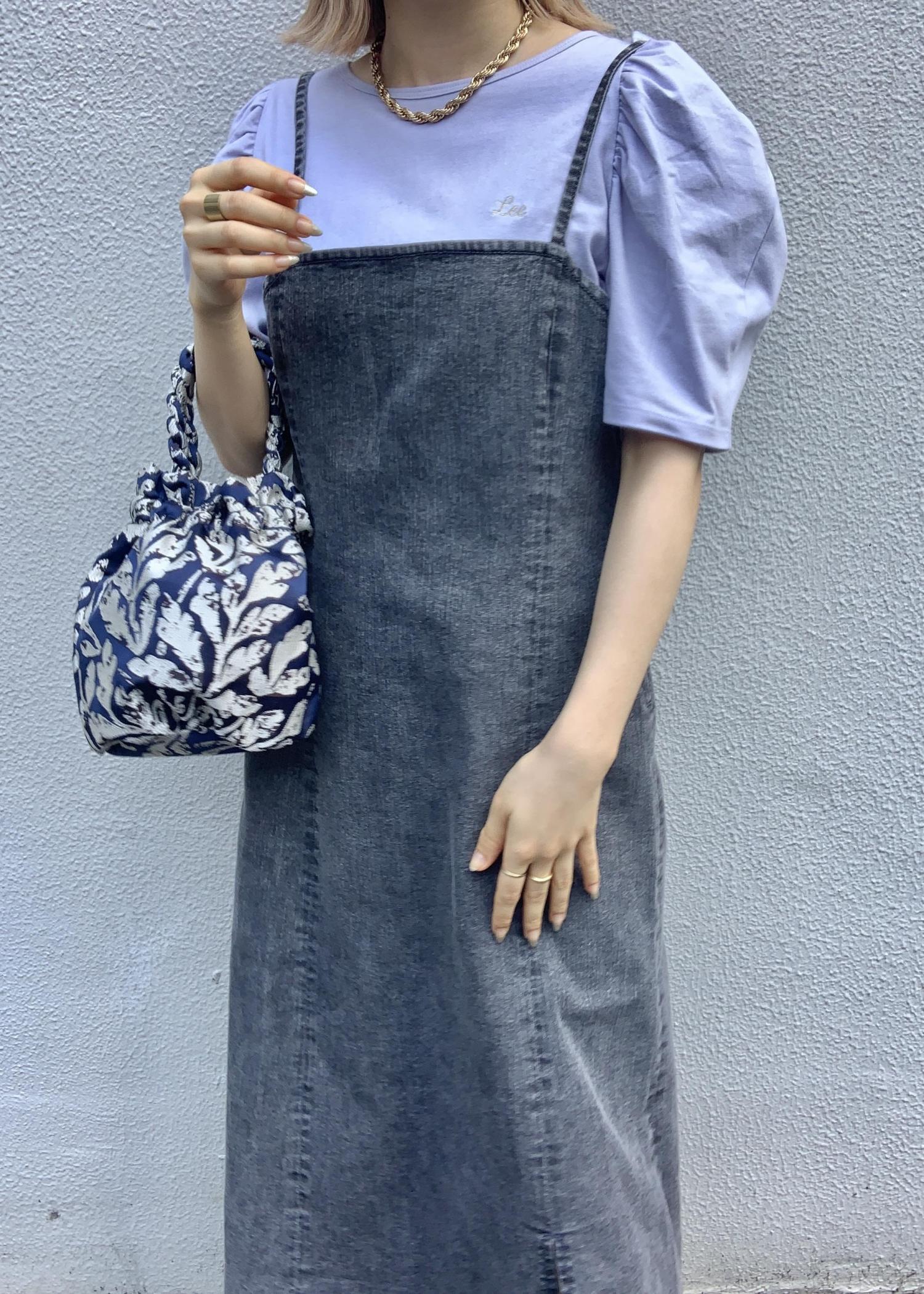 デニムシリーズにキャミワンピが登場です♪ シルエットがとてもきれいで、 体のラインを拾い過ぎないので着やすいです◎ インナー次第で今から秋も使えるので 長く着回しが楽しめます! ブラックとパープルでまとめて、 アクセントにヴィンテージ風の巾着を合わせた 大人カジュアルコーデです。